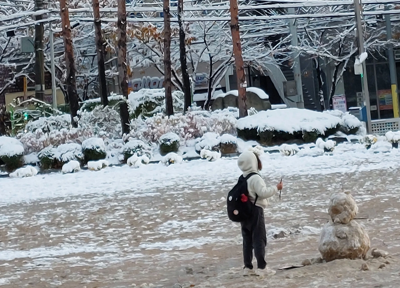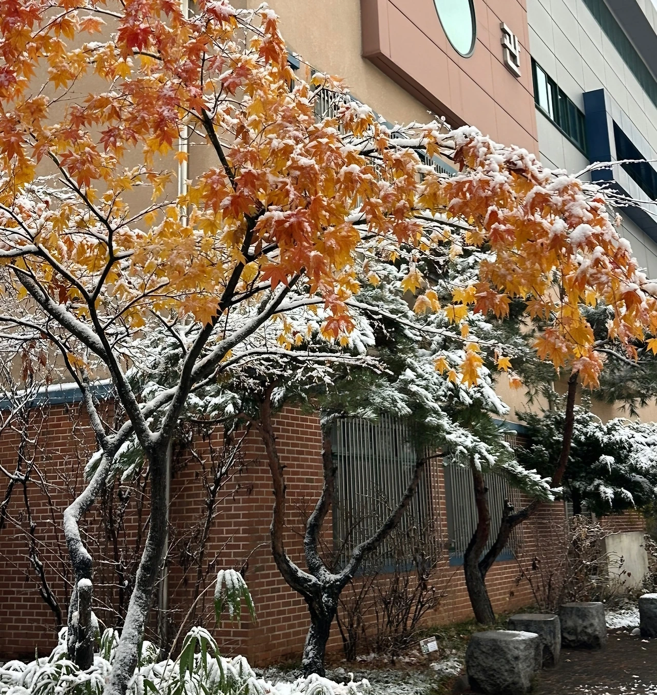 따뜻한 11월에 첫 눈이 내렸다. 아직 단픙잎도 가득한데 온통 새하얀 세상이 비현실적인 풍경이다.