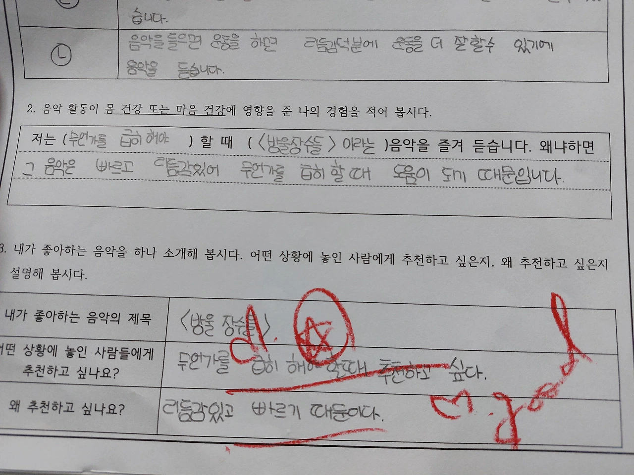 좋은 가수와 명곡들을 소개받는 즐거움에 기분 좋은 날이었어요. 음악을 매개로 마음을 나누는 기쁨이 참 행복하더라구요. 오늘도 아이들을 통해 새로운 노래를 배우게 되네요. 이제 얼마 안 남은 수업 시간에 아이들에게 이 좋은 노래들을 소개할 기회를 주어보려구요. 모두 신나겠죠? 이처럼 음악 전담의 삶은 정말 신나고 즐겁습니다. 직업만족도 천퍼센트에요.