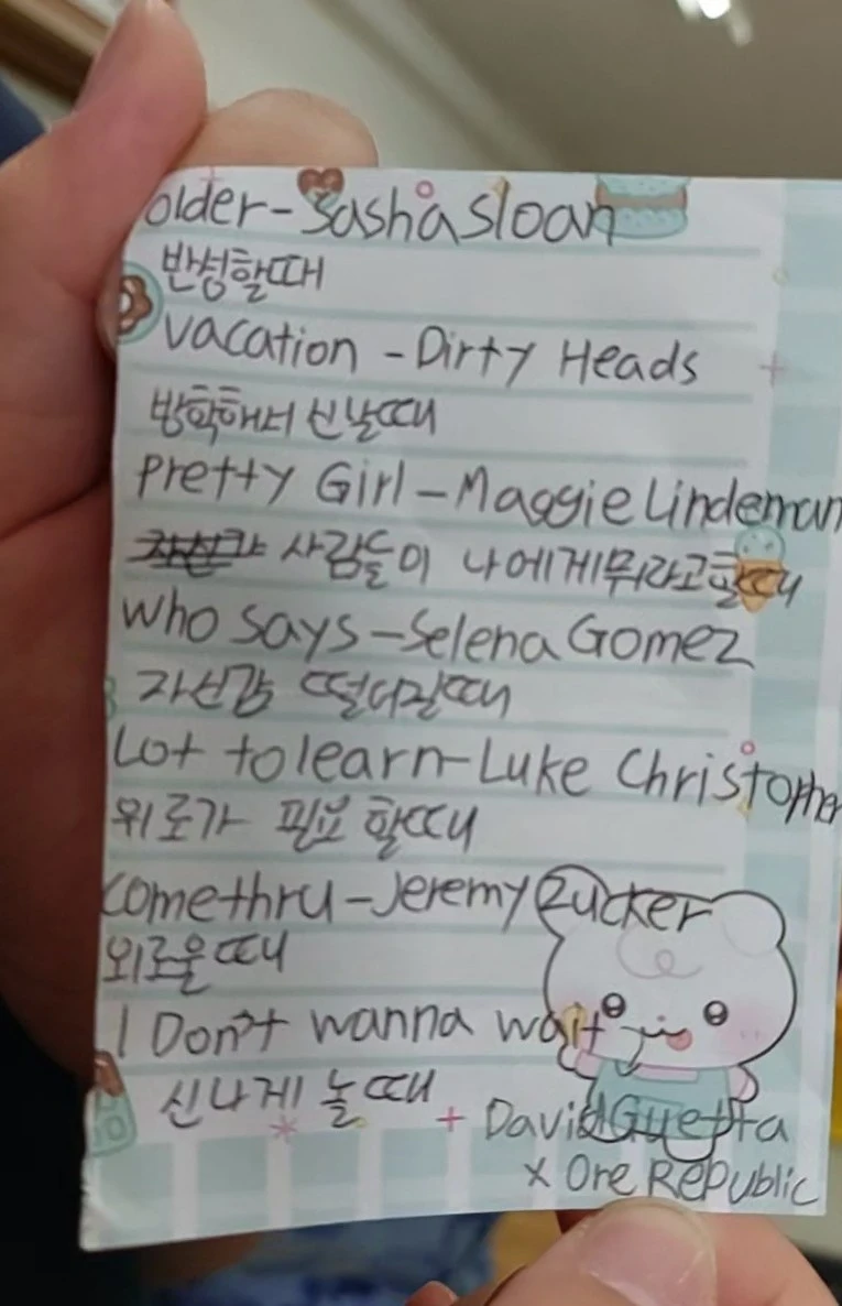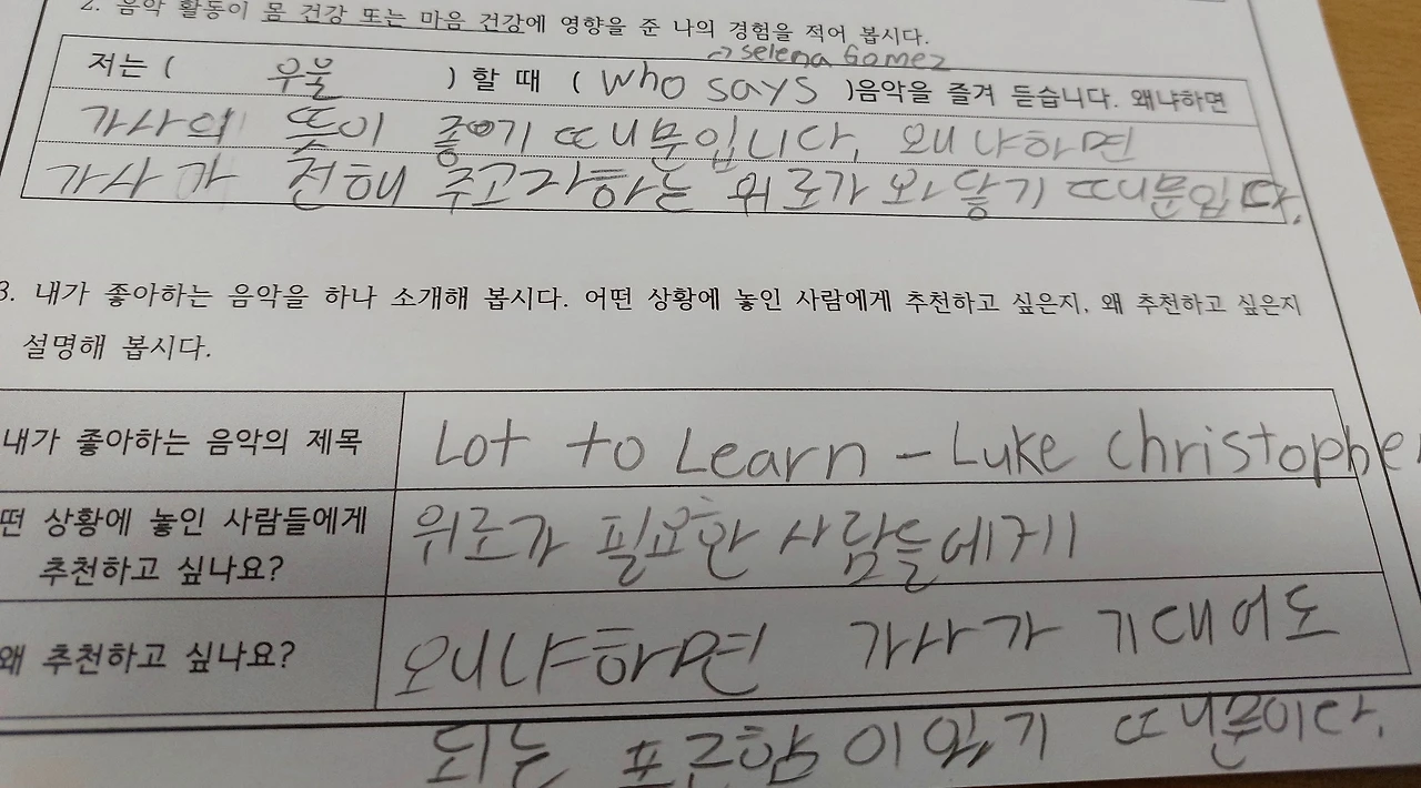 우울할 때 셀레나 고메즈에 who says를 듣는다는 이 친구! 와, 이 친구는 팝송 엄청 많이 듣는학생이군요. 위로가 필요한 사람에게는 Lot to learn을 추천한대요. 가사가 기대어도 되는 포근함이 있다는 그 말이 멋지죠?