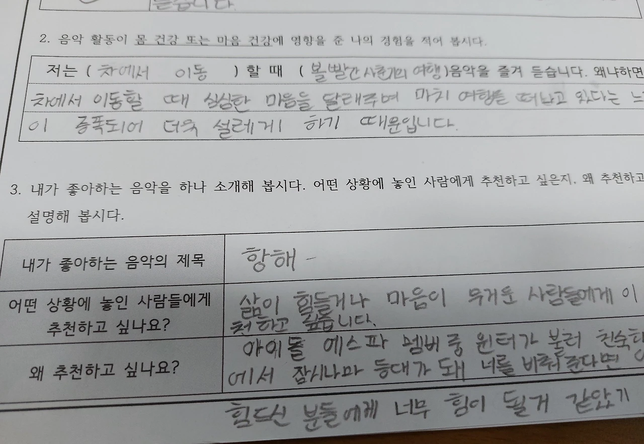 엄마 아빠랑 드라이브를 갈 때에 볼빨간 사춘기의 '여행 '을 듣는다는 이 어린이! 기특하게도 삶이 힘들거나 마음이 무거운 사람들에게 '항해'라는 곡을 추천한다고 적어 놓았네요. 이야