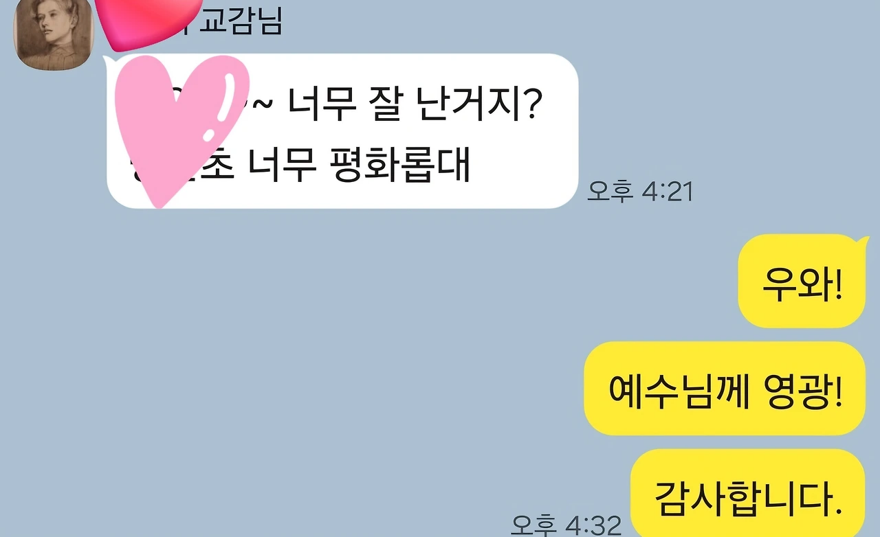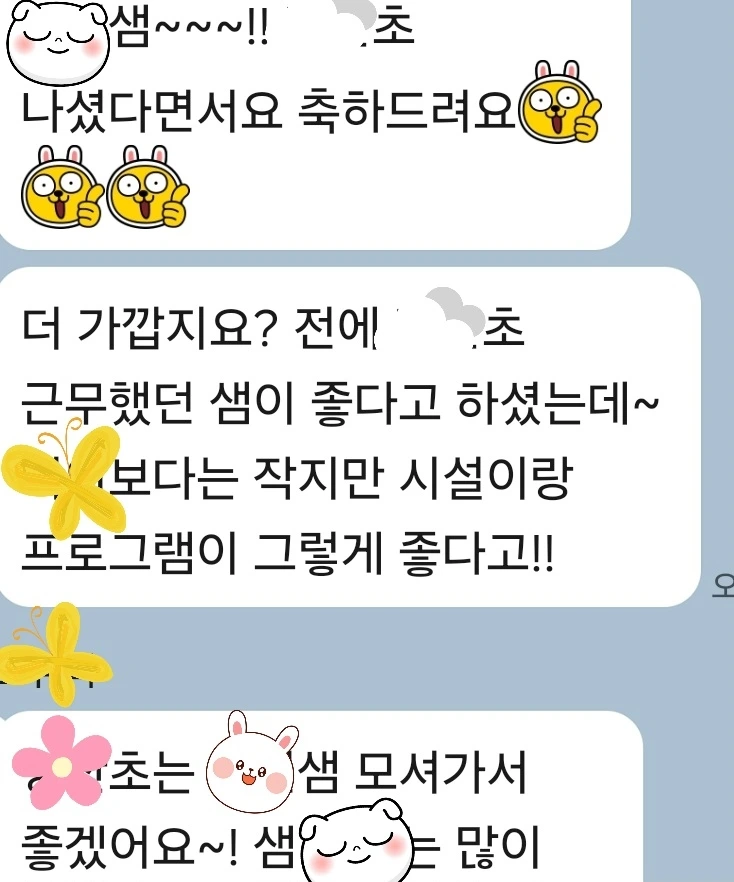 사랑하는 교감선생님께서도 문자를 보내 주셨다. 맨날 출퇴근길에 마주쳐서 우리가 전근을 가더라도 이렇게 가끔 우연히라도 만났으면 싶었는데 교감쌤 사시는 곳과는 경로가 달라져서 아쉽기 그지없다. 그래도 평화로운 학교라니, 말만 들어도 기쁘다.