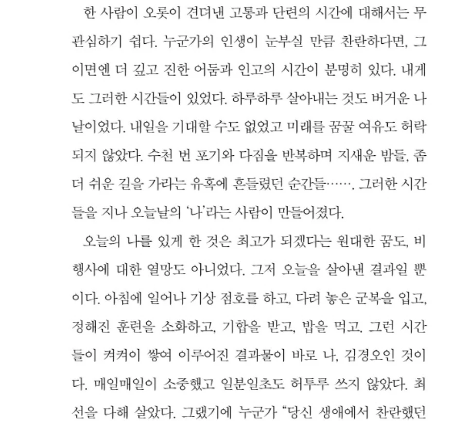 오늘의 나를 있게 한 것은 최고가 되겠다는 원대한 꿈도, 비행사에 대한 열망도 아니었다. 그저 오늘을 살아낸 결과일 뿐이다. 아침에 일어나 기상 점호를 하고, 다려 놓은 군복을 입고, 정해진 훈련을 소화하고, 기합을 받고, 밥을 먹고. 그런 시간들이 켜켜이 쌓여 이루어진 결과물이 바로 나, 김경오인 것이다. (6p)