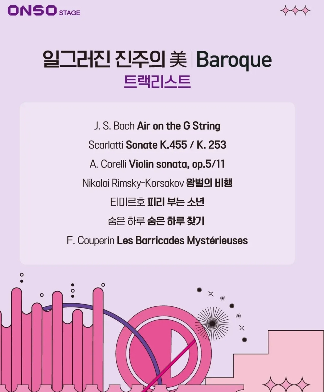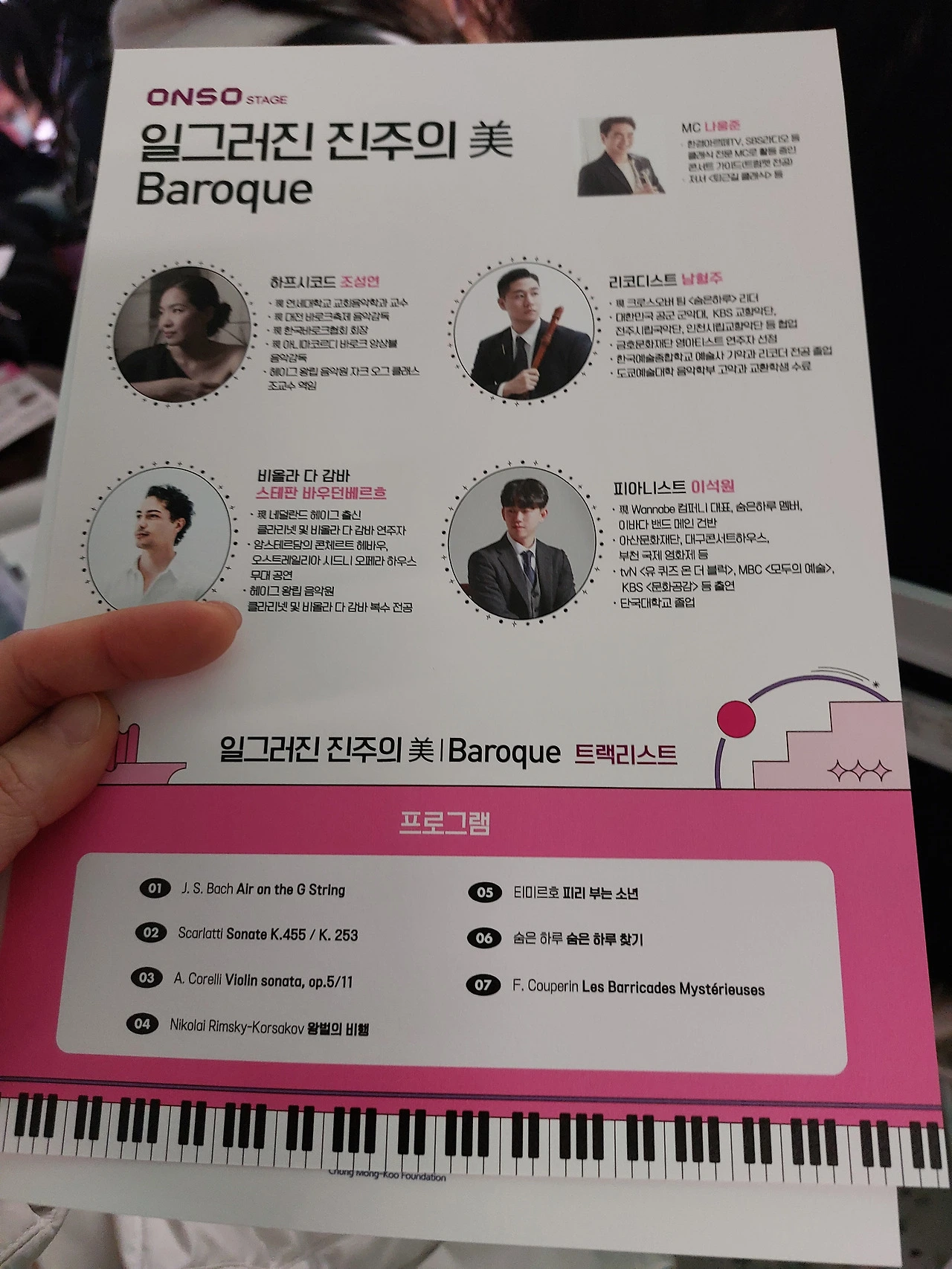 현대차 정몽구 재단 X 한경arteTV 가 주관하는 ONSO STAGE 아홉 번째 이야기 <일그러진 진주의 미ㅣBaroque> 공연에 다녀왔다. 단연코 오늘의 백미는 리코더의 활약이다. 코렐리, 쿠프랭과 요즘 만든 따끈 따끈한 이지리스닝까지, 그동안 리코더의 가능성을 잘 알지 못했던 대중들에게 반전매력 리코더의 가능성을 한껏 자랑할 수 있는 무대였다.