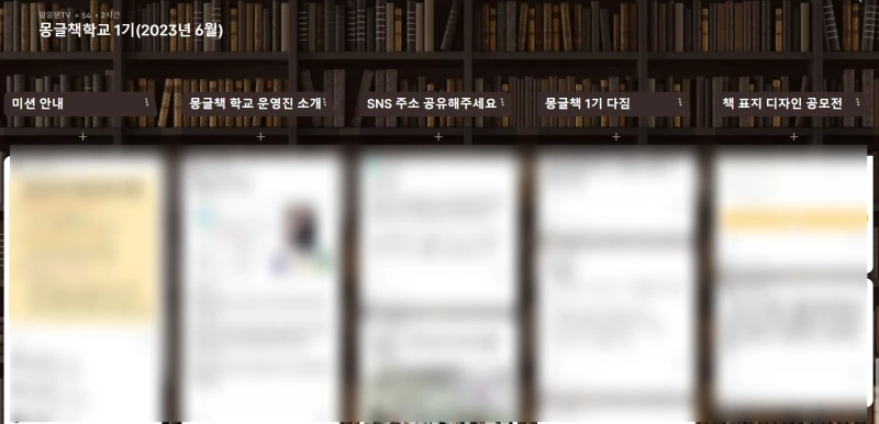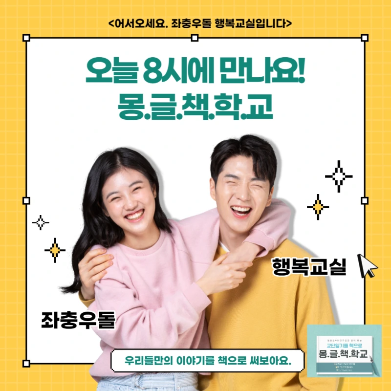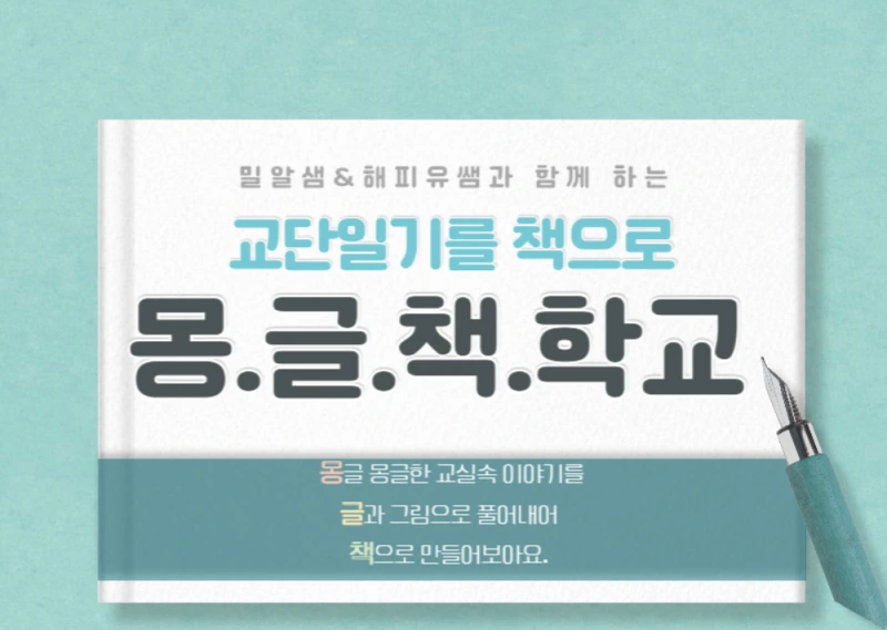 '몽글책 학교'는 인풀루언서 교사 김진수 선생님께서 만드신 교사들의 글쓰기 모임이다. 6월 한 달간 매일 글을 쓰고 카카오톡 채팅방으로 자신의 글쓰기 과정을 공유한다. 6월 21일 에는 온라인으로 모여 전자책 출판을 위한 제반 사항을 안내받았다.