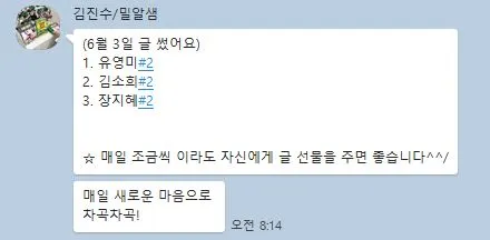 우리는 매일 카톡방에 '#며칠차 글 썼어요' 하고 글쓰기 인증을 남긴다. 이 과정을 통해 낙오되지 않고 한 달 글쓰기 도전을 성공할 수 있었다. 혼자 하면 힘들지만 함께 하니 수월하게 미션 클리어! 학교 생활에 지치고 피곤할 때에도 오늘은 무슨 글감을 써야 하나 생각하는 과정이 오히려 잡념으로부터 나를 보호해 주는 보호막이 되었다.