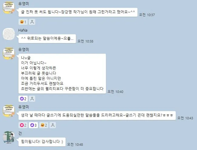 글쓰기 초반에는 글의 퀄리티보다는 꾸준함이 더 중요하다는 해피유쌤 말씀이 큰 위로가 되었다. '나 지금 마스터피스를 만드는 것이 아니고, 글쓰기 근육을 만드는 거야' 생각하니까 훨씬 속도가 더 잘 나갔다.