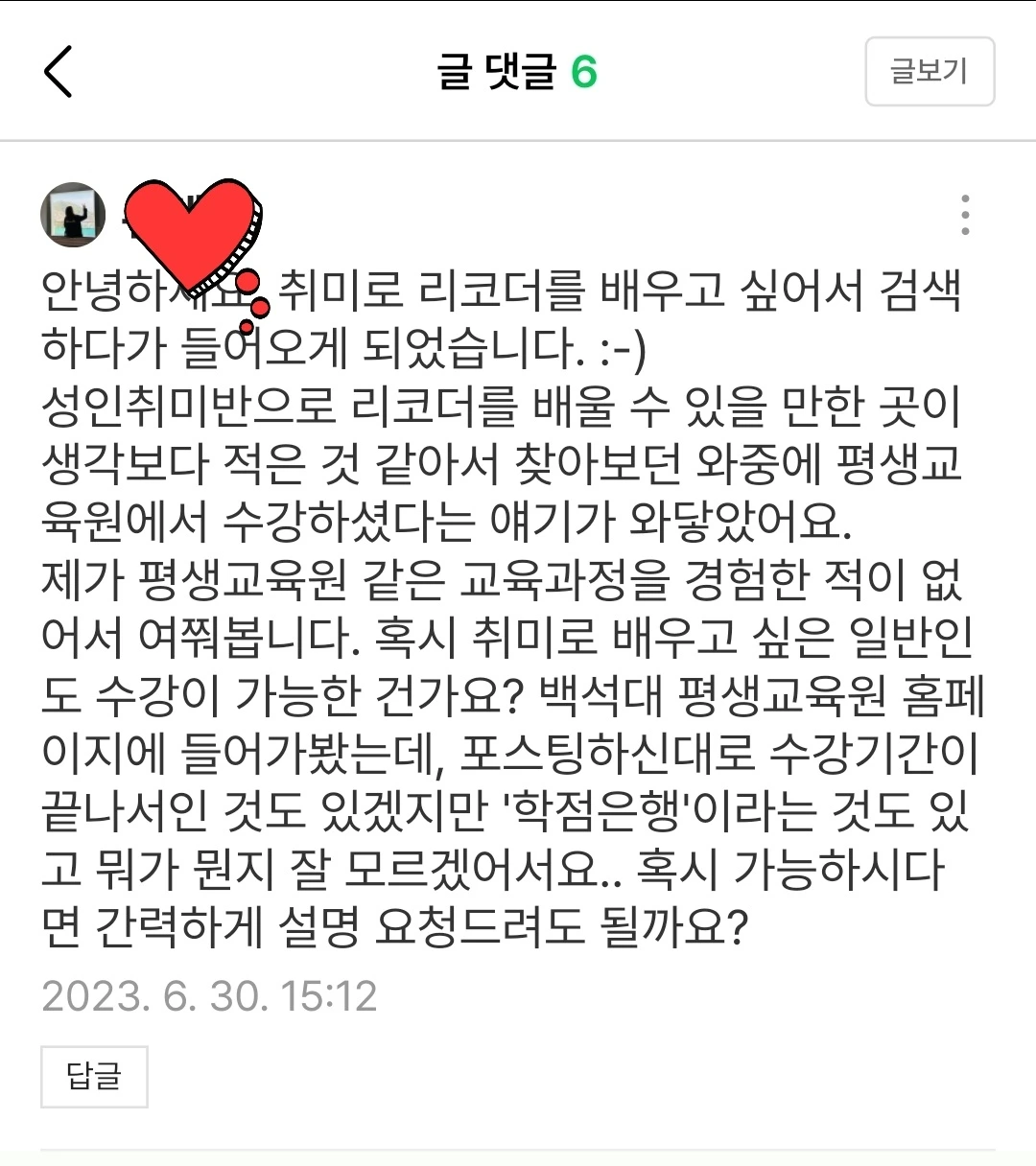 어제는 블로그 비밀 댓글로 모르는 분께 연락이 왔다. 내가 배우고 있는 대학부설 평생교육원 리코더 강좌에 대한 수강과 관련된 질문이었다. 리코더라는 악기가 워낙 마이너 하기에 교습정보가 참 부족한데 이렇게라도 내가 도움을 드릴 수 있어 참 행복하다.