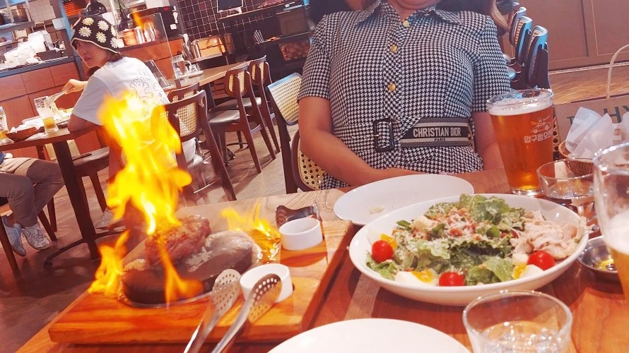 아래는 교감님과 맛있게 먹은 저녁 식사 메뉴! 레스토랑 직원분이 갑자기 고기에 불을 붙이는 '불쇼'를 보여주셨다. 깜짝 놀라 사진을 찍고있던 카메라를 놓칠뻔 했다. 여름 밤 마시는 맥주 맛이 더욱 더 시원하다.