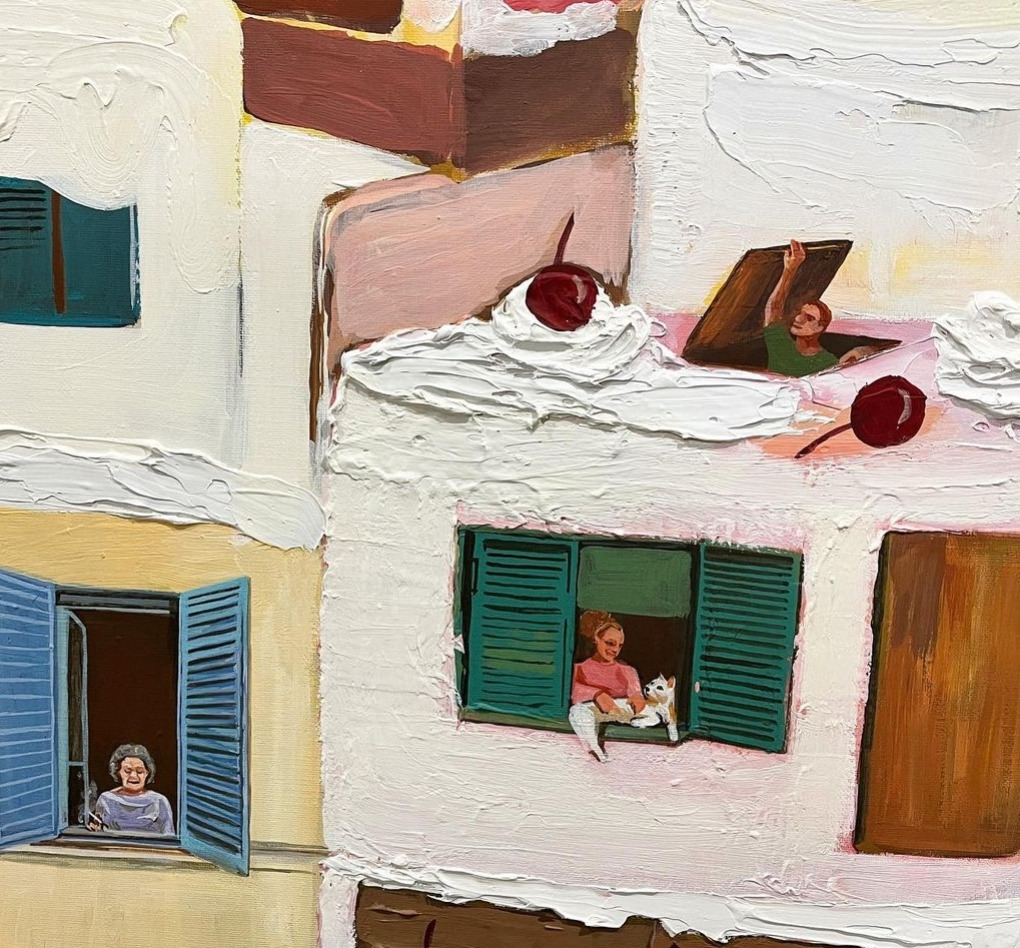 이렇듯 작가는 화려하지만 분절되어 있는 개인의 모습을 조각 케이크 속 사람들로 나타낸다. 창문 너머로 보이는 인물들은 모두 혼자다. 목욕 후 담배를 피우고 있는 여인, 애완동물과 같이 있는 사람, 그리고 노인.