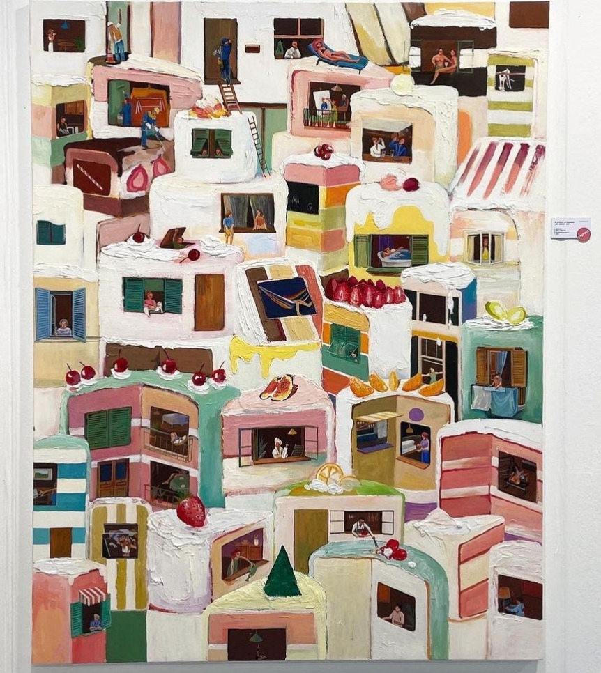 작품을 그린 작가와 관람객이 함께 만나 그림에 대해 이야기 나누는 이 자리가 너무 소중하고 정겹게 느껴졌다. 작품 속 뒷 이야기도 들을 수 있고 말이다. 아래 작품의 제목은 '달콤쌉싸름한 도시'이다. 겉으로 보면 너무 맛있게 생긴 조각 케이크들! 진짜 맛있게 보인다.