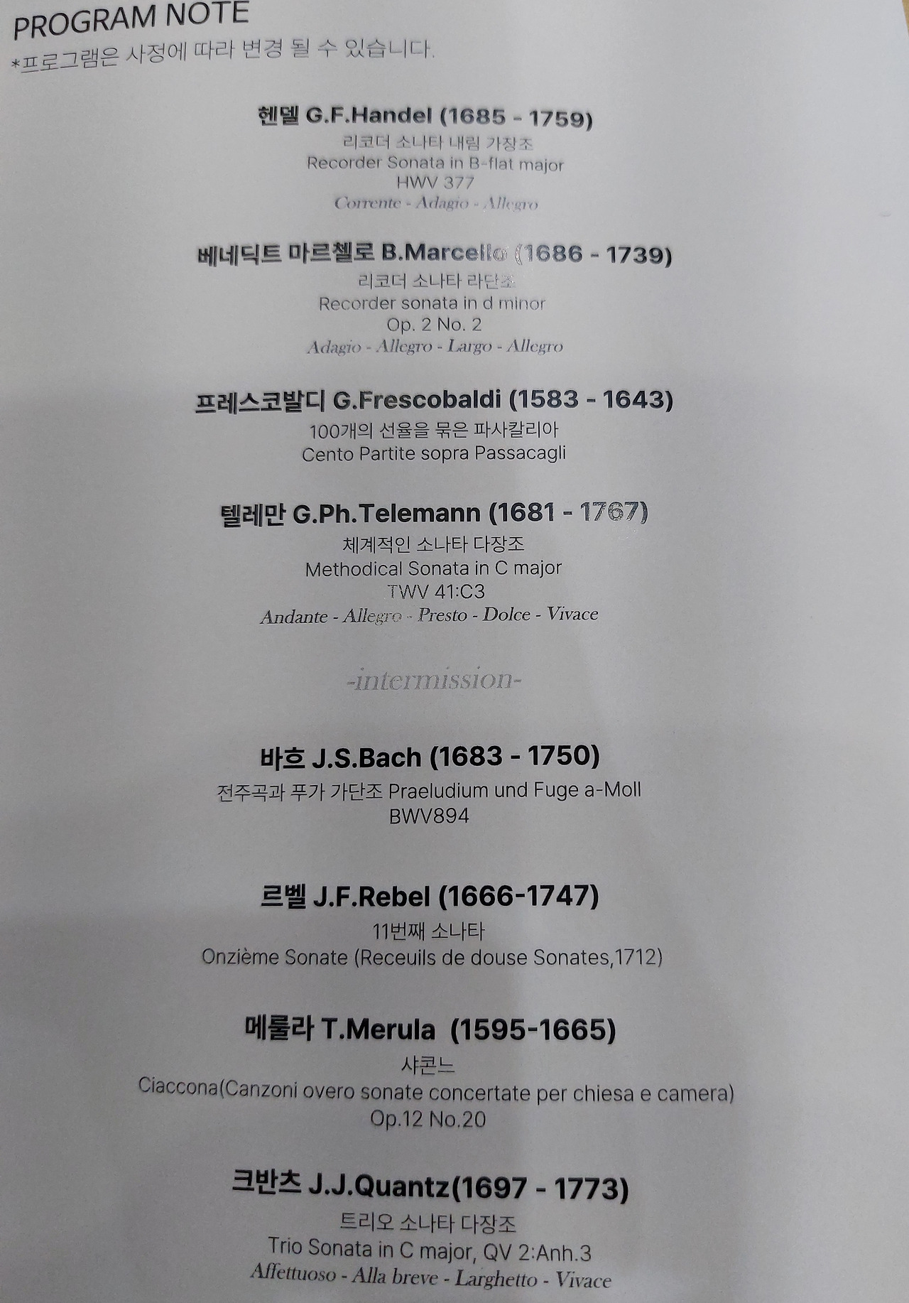 첫 곡은 내가 너무도 좋아하는 헨델의 HWV.377 작품이었다. 나 또한 이 곡을 레슨 시간에 연주해 본 적이 있는지라 애정이 많은 곡이었다. 뒤이어 마르첼로, 텔레만까지 우리가 아는 유명한 바로크 리코더 곡들의 연주가 이어졌다. 이어서 쳄발로의 독주곡들, 프레스코발디의 100개의 선율을 묶은 파사칼리아와 바흐의 전주곡과 푸가 가단조 BWV.894 도 이어졌다.
