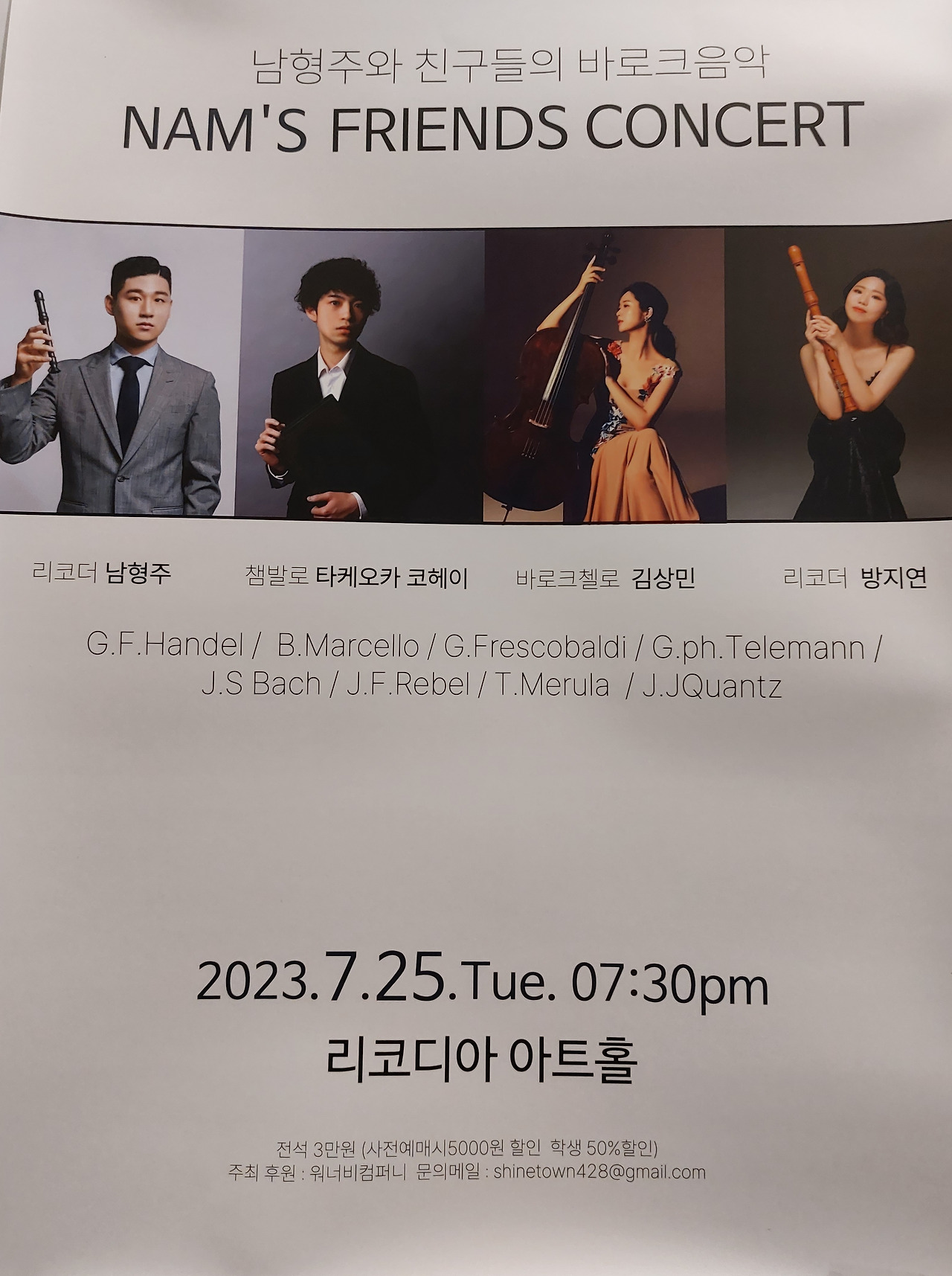 2023.7.25. 화요일 저녁, 신사동 리코디아 아트홀에서 남형주와 친구들의 바로크 음악 공연을 만났다. 지난주 일요일 인천문예회관에서의 공연에 이어 이틀 만에 만난 그는 완전히 다른 색깔을 옷을 입고 우리를 맞이했다. 악기도 다른 악기, 시대적 특징도 다른 시간, 360도 새로운 레퍼토리를 펼쳤다. 오로지 같은 점은 단 하나, 바로크 첼로 및 비올라 다 감바를 연주하신 김상민 선생님이 또 출연하신다는 것 정도!지난 일요일이 대중적으로 친밀하고 익숙한 곡들을 기반으로 한 곡들로 구성되었다면 이번 공연은 남형주 연주자가 일본 교환 학생 시절 만난 쳄발로 연주자와 함께 300년 전 바로크 음악을 연주한다는 것에 의의가 있었다.
