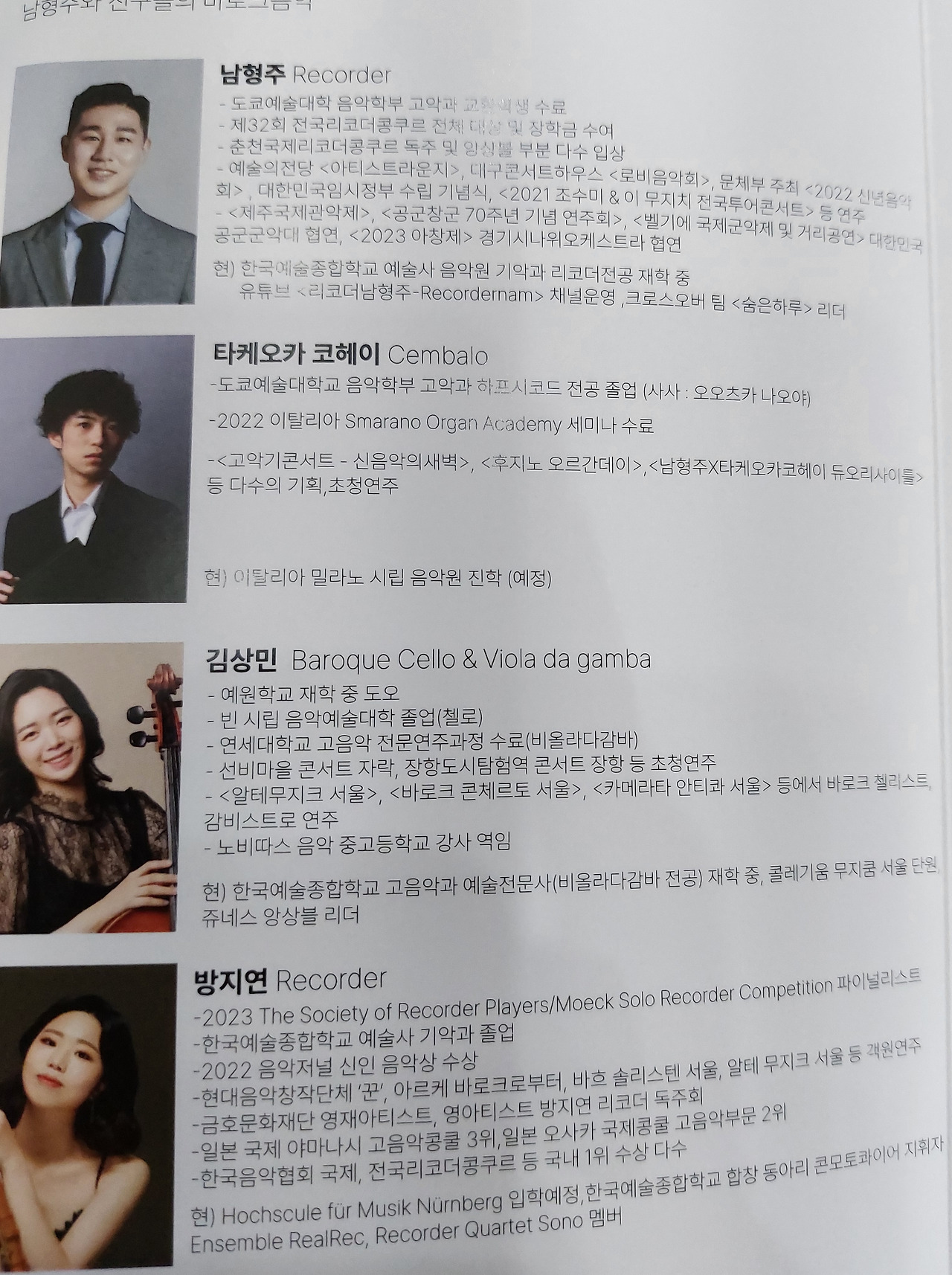 한국에서 리코더로 단독 콘서트를 열 수 있는 사람도 손에 꼽을 것이고, 단독 공연에 이렇게 유료 관객이 꽉꽉 들이차는 경우도 흔치 않을 것이고, 그 와중에 쳄발로 전문 반주자가 남형주 님이 일본 교환학생 시절에 만나 함께 공부하고 듀오 콘서트를 열었던 '타케오카 코헤이'님이라는 사실은 정말 일이 될라고 하니까 되는구나 싶은 지점이었다. 이 공연에 수많은 시간 고민하여 프로그램을 짜고 대관을 하고 심지어 팸플릿까지 손수 만들으셨다는 이야기를 듣고, 저 젊은이는 잘 될 수밖에 없는 사람이다. 앞으로 얼마나 더 잘 될지 너무 기대된다 싶었다.