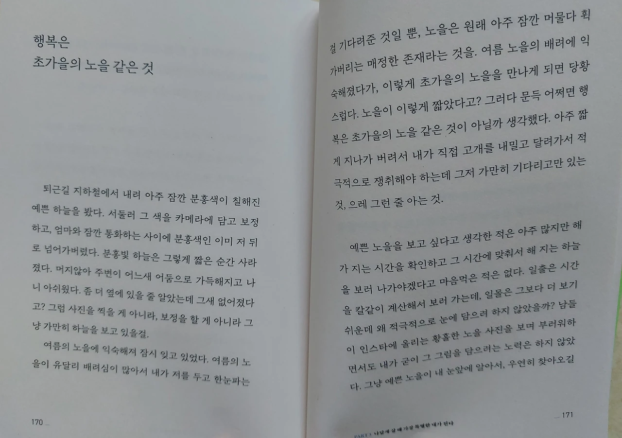 행복은 초가을의 노을 같이 잠시 왔다 사라진다. 이 얼마나 시적인 표현인지! 너무 짧다. 계획을 짜고 기대하고 기다리지 않으면 놓쳐버린다.