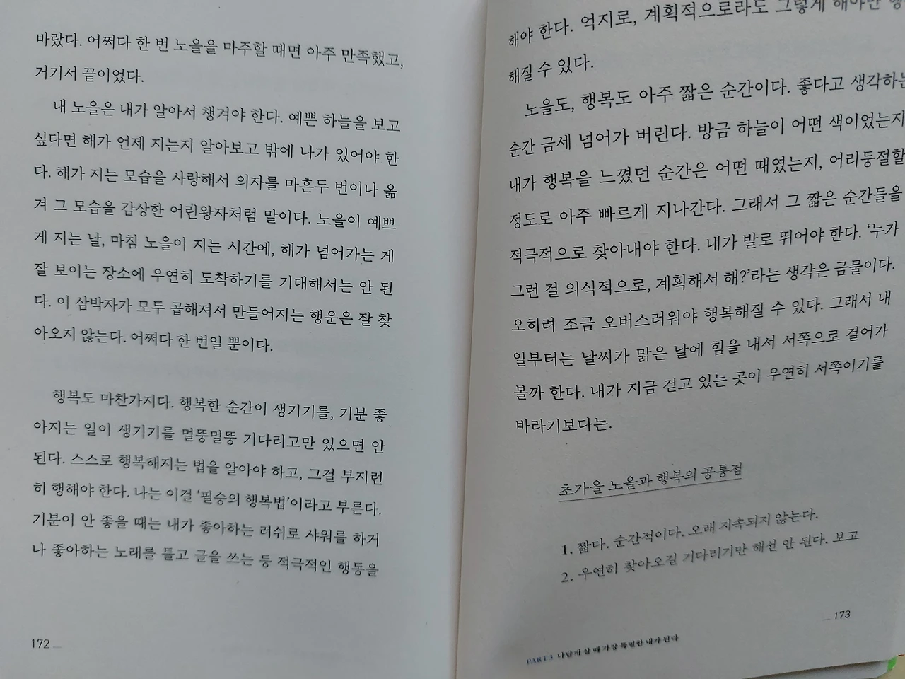 스스로 행복해지는 법을 알아야 하고 그걸 부지런히 행해야 한다. 이게 바로 필승의 행복법임! 기분이 나쁠 때는 행동을 취해야 한다. 예를 들어 향이 좋은 러쉬 바디워시로 목욕하기, 좋아하는 노래를 듣기, 글을 쓰는 일 등등!