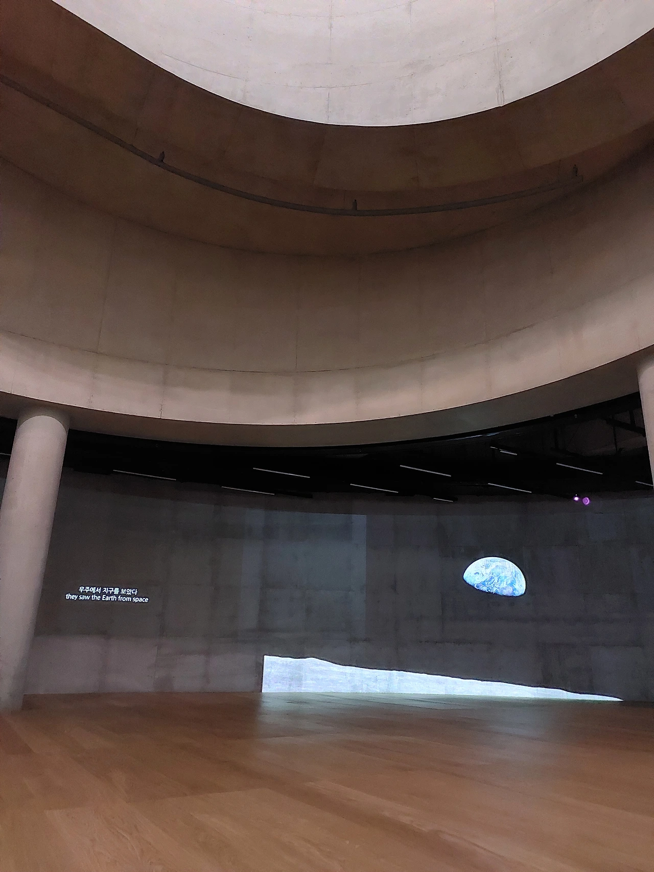 영상 속에 푸른 우리 지구가 나왔다. 그러자 전시를 관람하던 사람들이 어느 누구 할 것 없이 동시에 스마트폰을 들어 지구를 찍기 시작한다. 그 일사불란함이란! 마치 영화관에서 웃긴 장면이 나오면 다 같이 깔깔되며 폭소를 터트리듯 동시 다발적으로 이루어지는 카메라 셔터는 인터뷰를 찍는 카메라맨 못지않다.