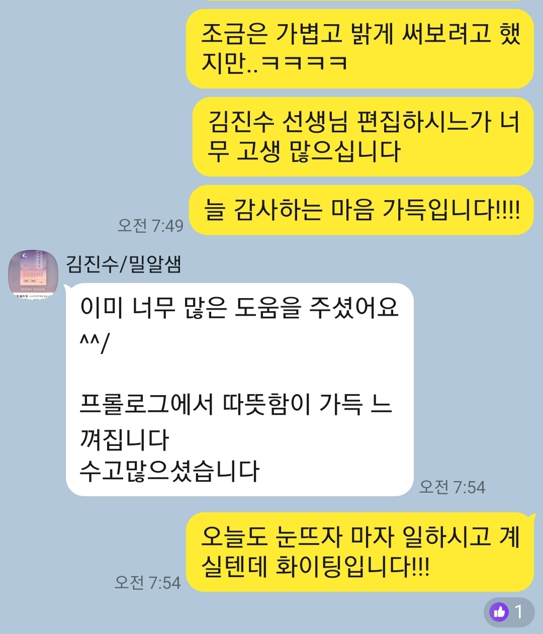 전자책으로 만들어져도 감지덕지라고 생각했는데 정식 출판이라니, 이게 무슨 일이래~한 달동안 매일 카톡방에서 서로의 글을 읽어주고 창작을 독려하며 어느새 가족처럼 끈끈해진 우리의 글쓰기 동지 19명은 모두 기쁨의 눈물을 흘렸다.