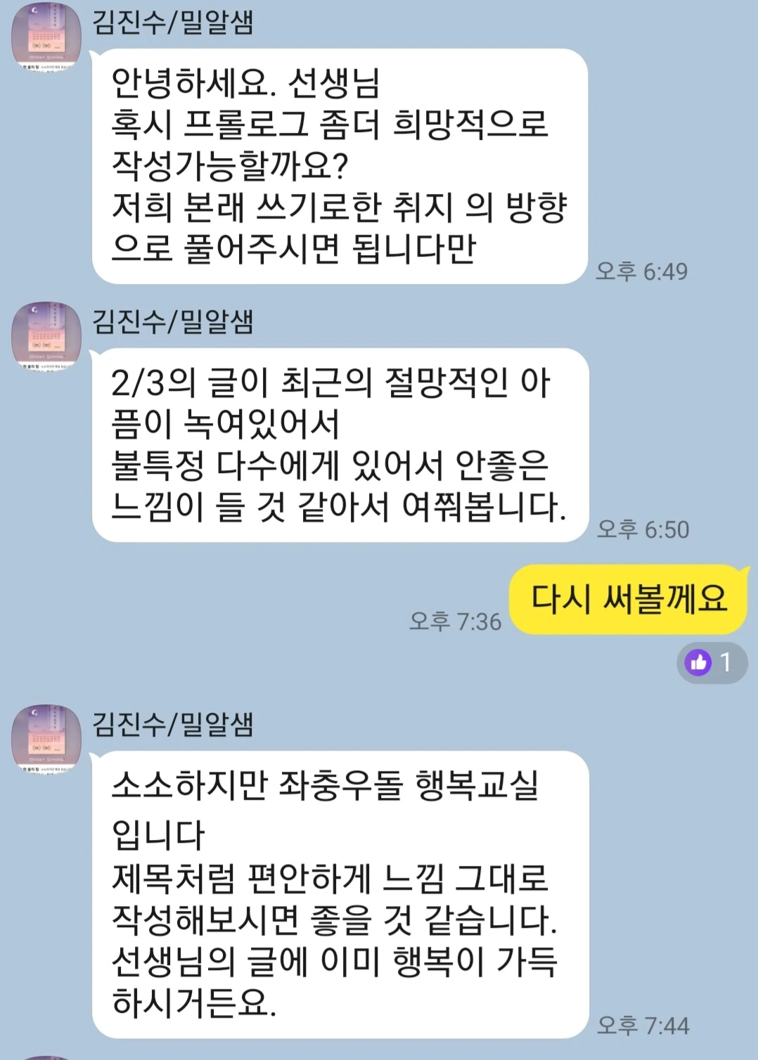 처음 쓴 프롤로그는 요즘 시국이 시국인지라 나도 모르게 너무 무겁게 써 버렸다. 우리 몽글책 학교는 선생님들의 내밀한 마음속 기쁨과 슬픔, 보람과 행복을 담은 에세이집인데 머리말이 너무 비장하다. 김진수 선생님께 피드백을 부탁드렸더니 너무 절망적인 아픔이 느껴진다고 하신다. 어쩔 수 있나, 다시 써야지.