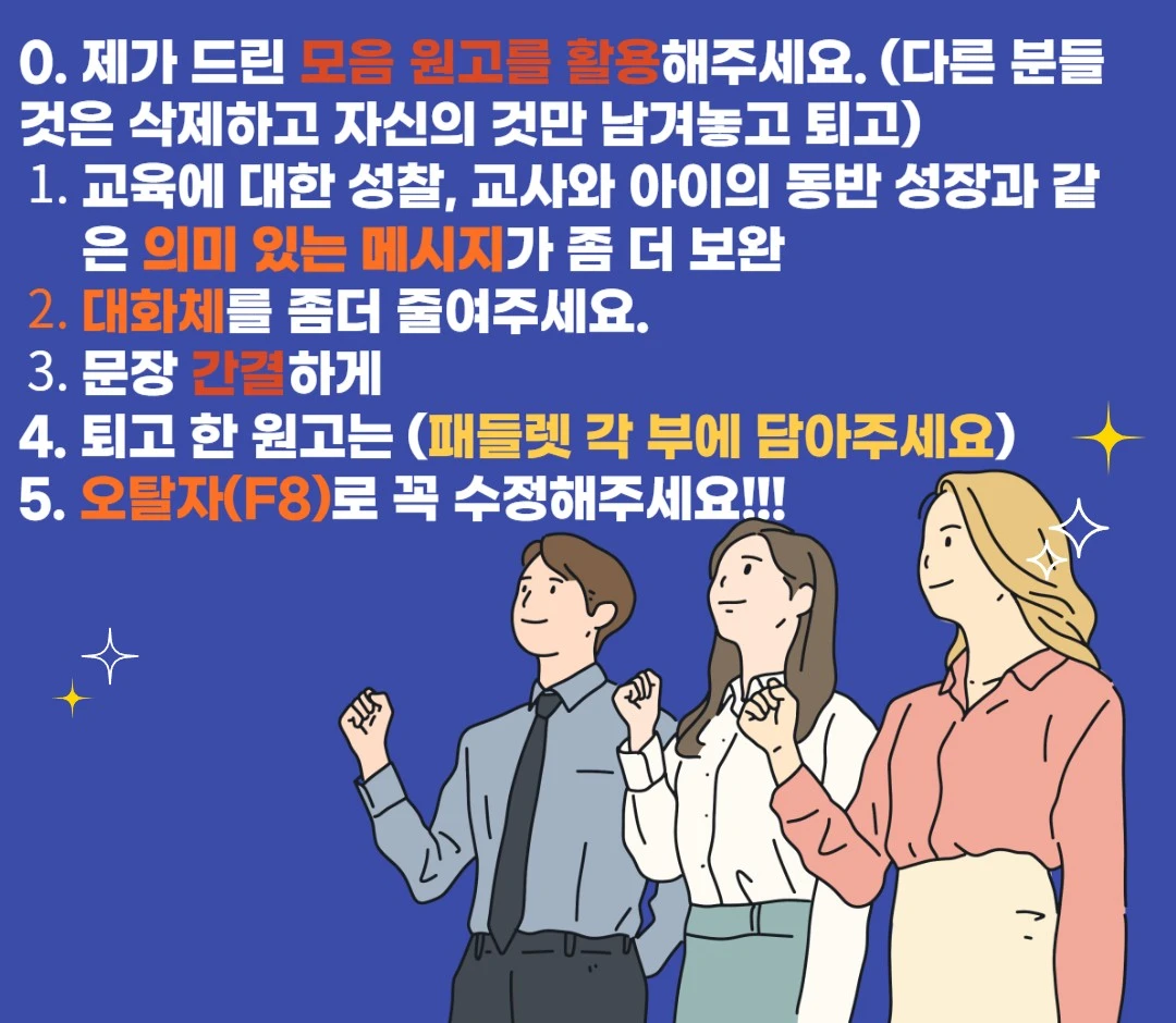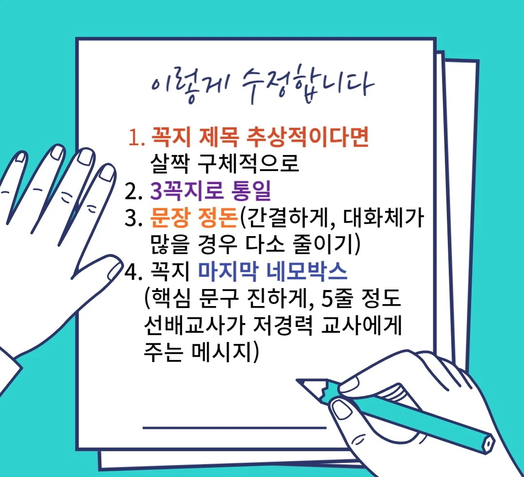 혼자만 알기 아까운 교직 생활의 꿀팁들은 에피소드 말미에 따로 정리해 두었습니다. 먼저 교직을 경험한 선배들이 후배 교사들에게 전해주는 교무수첩 속 기록이라고 생각해도 좋습니다. 교실 속 삶의 흔적을 성실히 기록해 놓은 선생님들의 글에서 아이들을 향한 따뜻한 시선이 느껴집니다. 힘든 현실 가운데에서도 묵묵히 교실을 지키고 있는 대한민국 모든 선생님을 응원합니다.