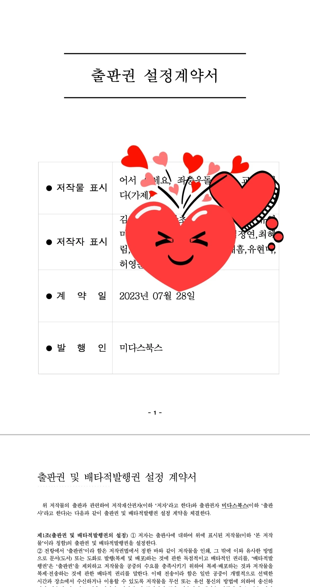 몽글책학교의 글이 출판되게 되었다. 만세! 원래는 전자책으로 출판하고자 하였으나, 우리의 대장님 김진수 선생님의 각고의 노력으로 정식 출판을 하게 되었다. 계약서에 있는 내 이름을 보니 보고 있으면서도 믿기지 않았다. 계약금도 들어왔다는 감동적인 이야기도 전해 들었다.