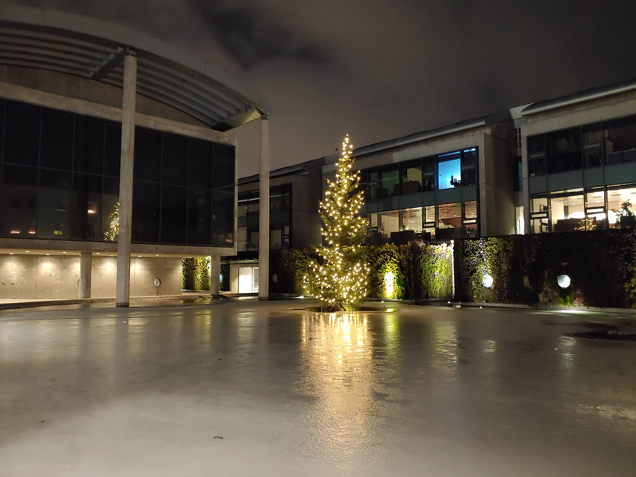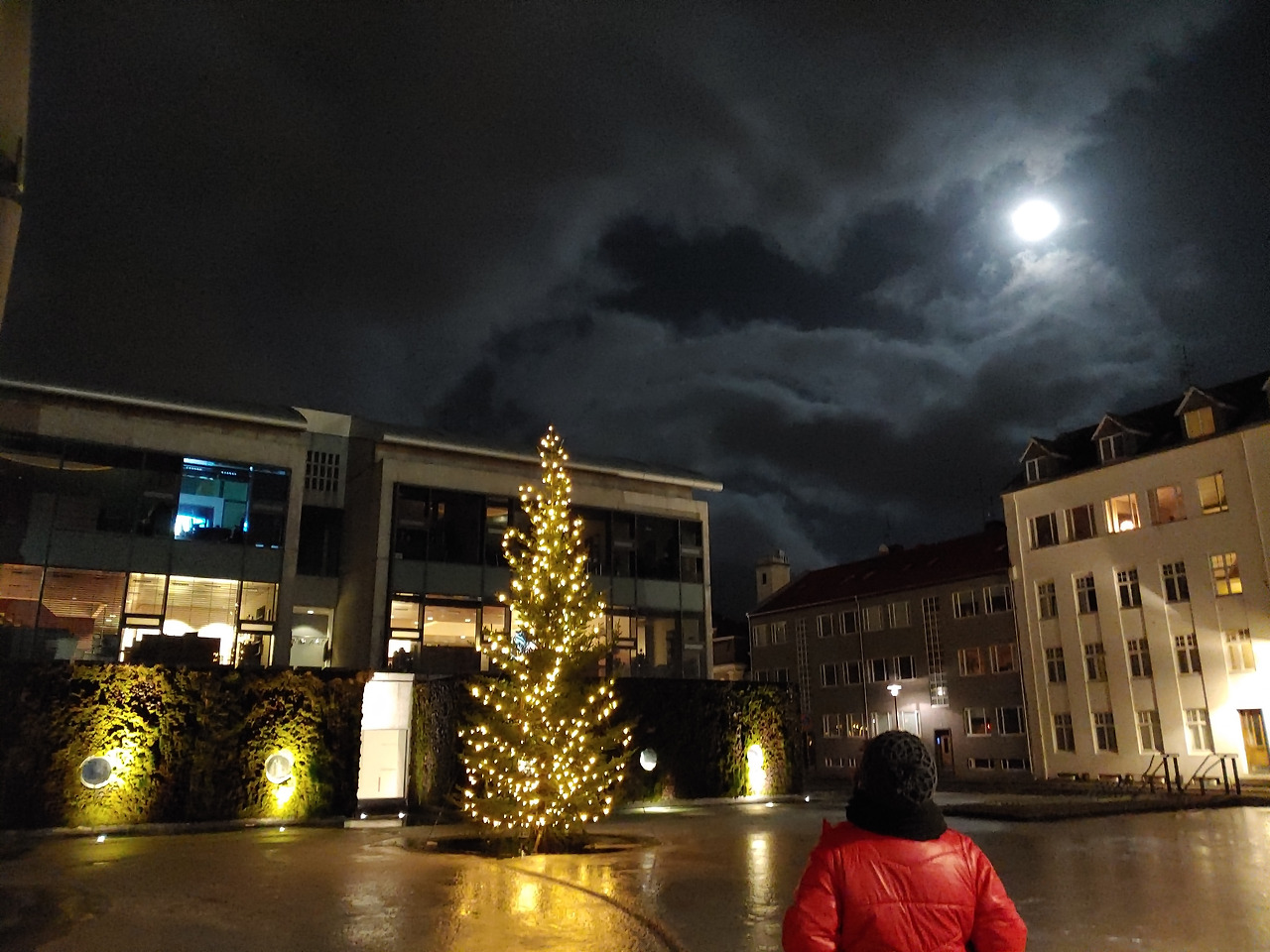 예약한 7am에 공항버스를 기다리며 시청 앞 크리스마스트리 조명과 보름달로 인증샷을 남기고 예정대로 공항으로 간다.