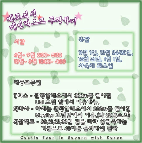 (아침 8시 뮌헨 중앙역에서 출발~오후 6시까지 뮌헨 중앙역 도착하며 버스는 선착순으로 좌석을 이용하므로 미리 나가서 창가에 자리를 잡도록. 투어 순서는 시즌에 따라 진행방법이나 소요시간이 달라질 수 있습니다.)