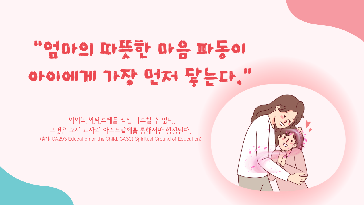 아이는 미성숙한 감정체를 가지고 있기에 어른의 파동에 매우 쉽게 동기화됩니다. 어른이 안정되면 아이는 편안해지고,어른이 흔들리면 아이의 감정도 그대로 흔들립니다. 슈타이너가 말한 ‘감싼다’는 표현은 결코 철학적인 비유가 아니라 목소리라는 물리적 파동을 통해 매일 일어나고 있던 일이었습니다.