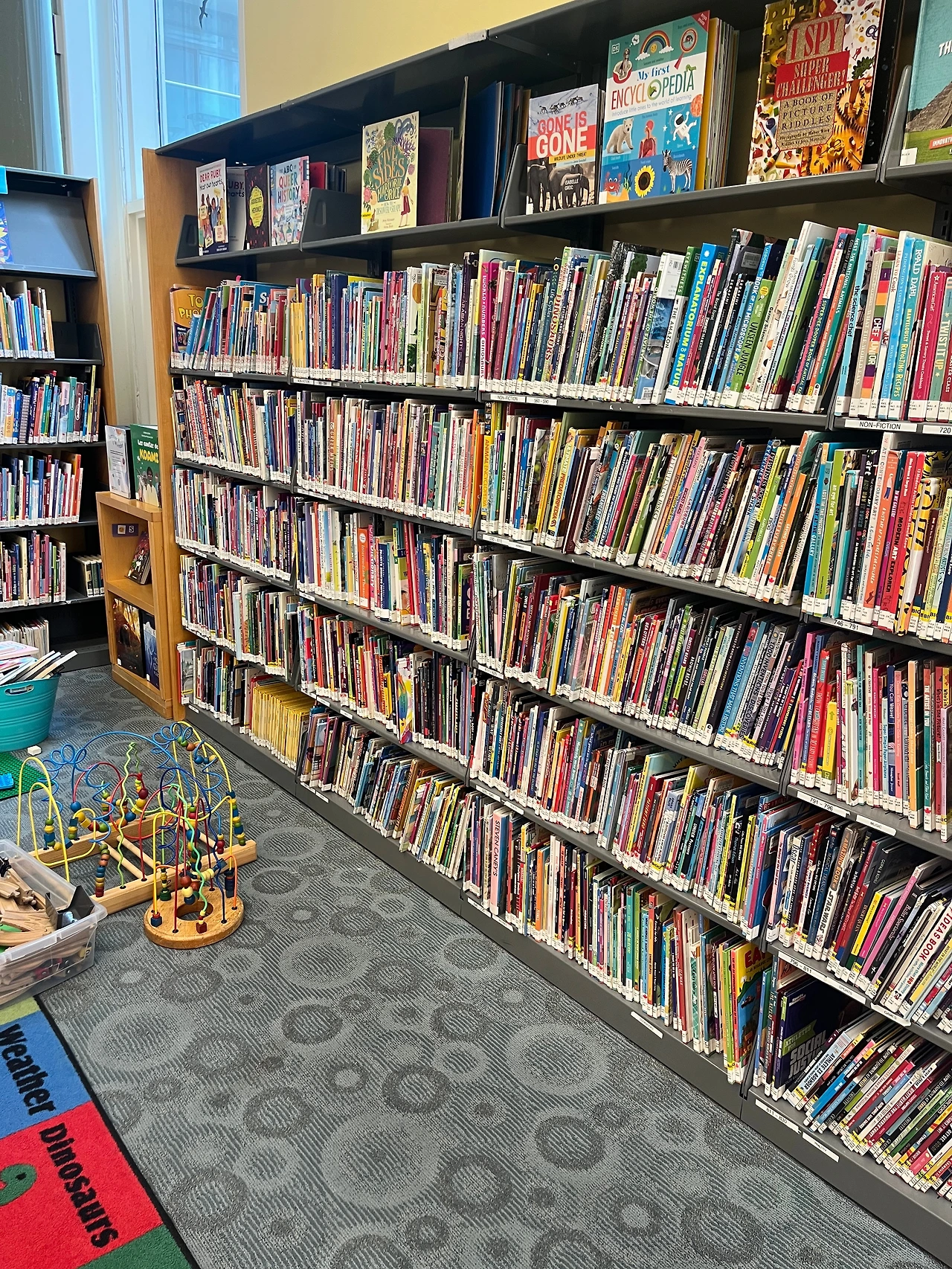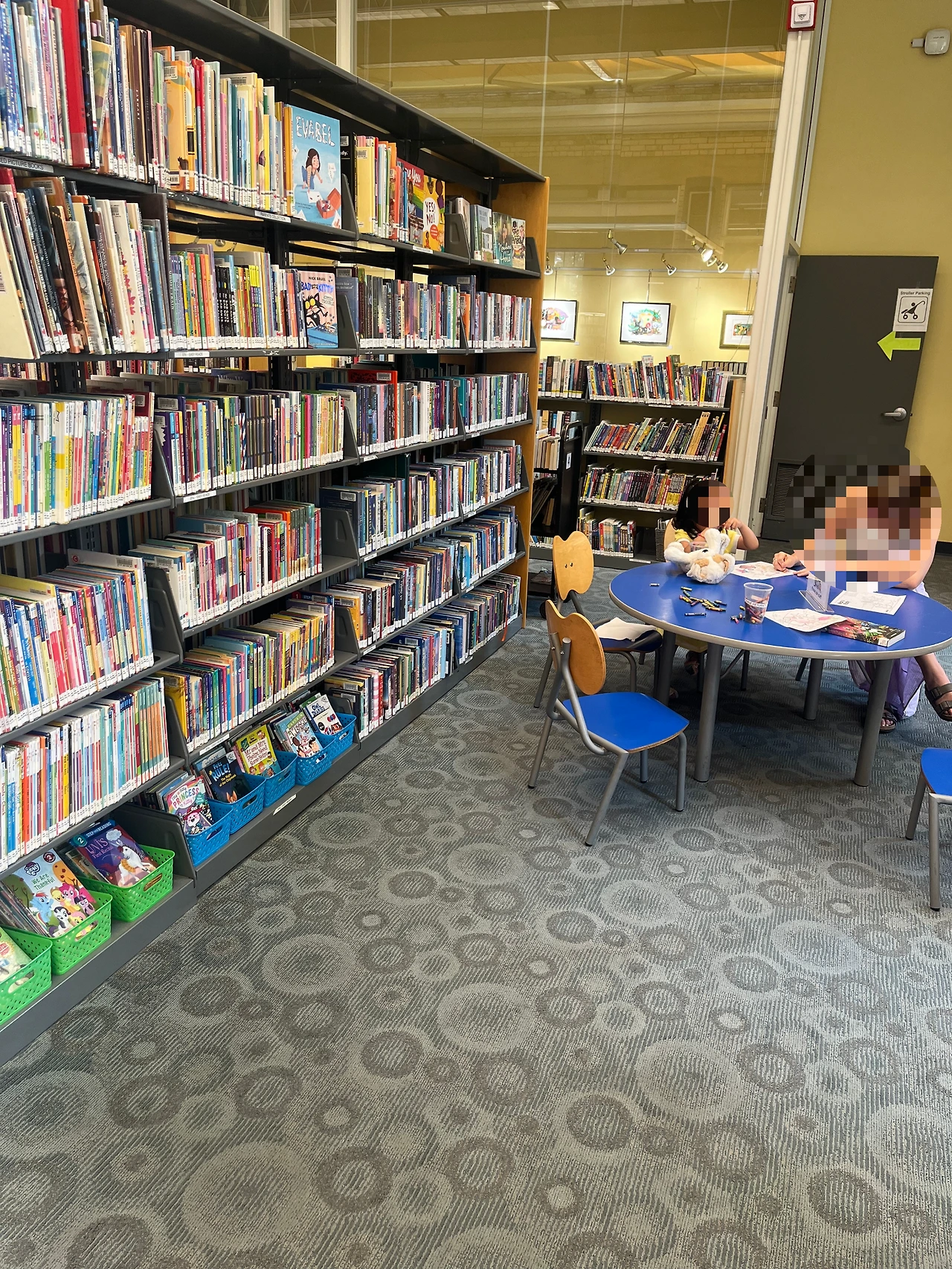 우리는 본관에서 3분 남짓 떨어진 곳에서 별관과 같은 곳을 발견할 수 있었다. 안내데스크를 지나 내부로 깊숙이 들어오자 곧 어린이용 공간이 나타났다. 이미 내니로 보이는 사람들과 몇몇 아이들이 와서 놀고 있었다. 사방이 책장으로 둘러싸인 아늑한 홀에는 장난감이 놓여 있었고, 한쪽엔 그림을 그릴 수 있도록 낮은 탁자와 의자도 비치되어 있었다. 둘째는 부리나케 달려가 기찻길을 만들기 시작했고, 첫째는 한 자리 차지하고 앉아서 페파피그 그림을 알록달록 꾸미기 시작했다. 아이들 모두 자유롭게 말하고 움직이는 분위기였는데, 건물 구조가 소리를 흡수하는지 아니면 기분 탓인지 소음이 그다지 거슬리지 않았다.