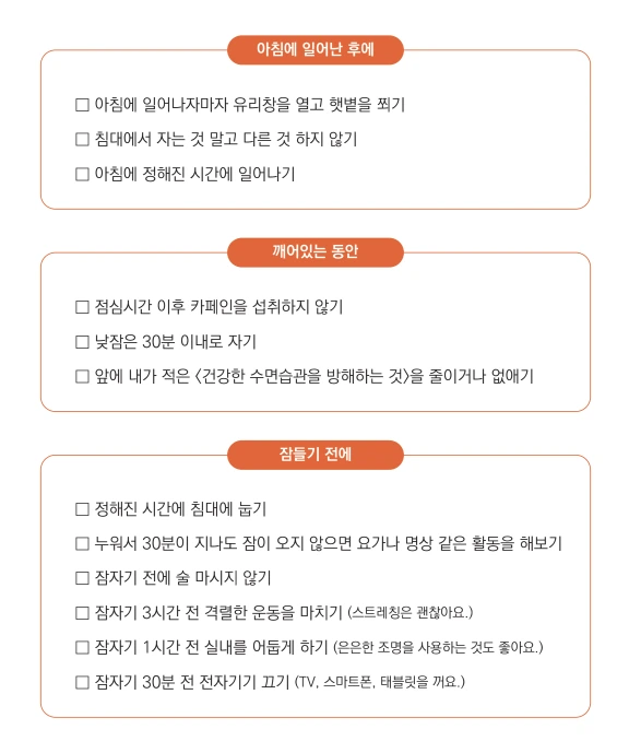 아침에 일어나 햇볕을 쬐는 것은 불면증에 많은 도움이 되는데, 이는 햇빛이 수면과 같은 신체 생리작용을 조절하는 '생체시계'와 수면호르몬으로 불리는 '멜라토닌' 분비에 직접적인 영향을 주기 때문이에요. 또, 신체가 침대라는 공간을 '잠만 자는 공간'으로 인식하게 만드는 것도 중요해요. 우리는 무심코 침대에서 휴대폰을 보거나 책을 읽는 등 다양한 생활을 하는데, 이런 행위는 '누우면 잠든다'는 신체의 조건반사가 사라져 오히려 불면증을 조장하거나 악화시킬 수 있어요. 반대로 침대에 눕기만 해도 정신이 번쩍 드는 잘못된 조건반사가 성립될 수 있어요.