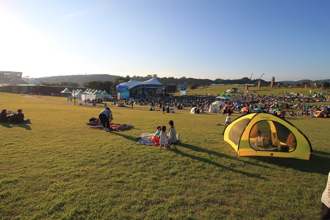 평화누리공원은 드넓은 잔디밭에 한가운데 무대가 있어서 야외공연하기에 안성맞춤이다. 뒤의 객석은 의자가 필요없이 개인들이 매트나 파라솔, 야외의자를 가지고 나와 있고, 아이들을 데리고 나온 부모는 작은 캠핑용 텐트까지 치고 공연을 즐길 만반의 준비를 마치고 있었다. 무대는 아래에 있고, 뒤쪽으로 갈수록 지대가 높아져서 가능했다.