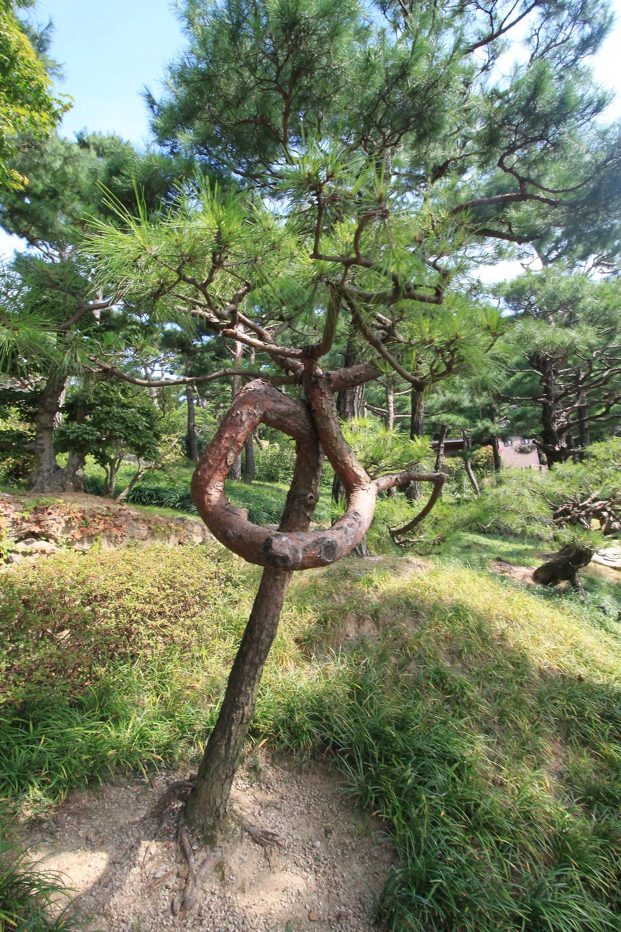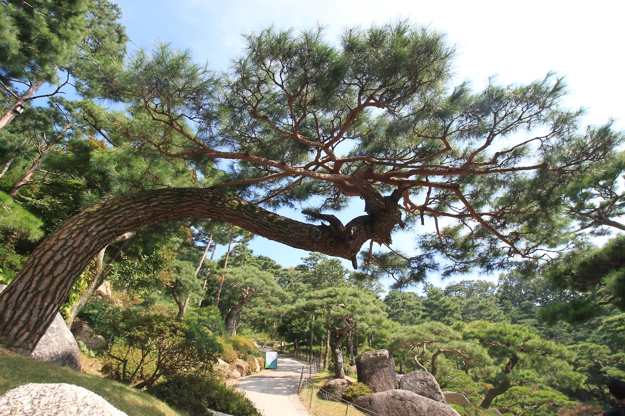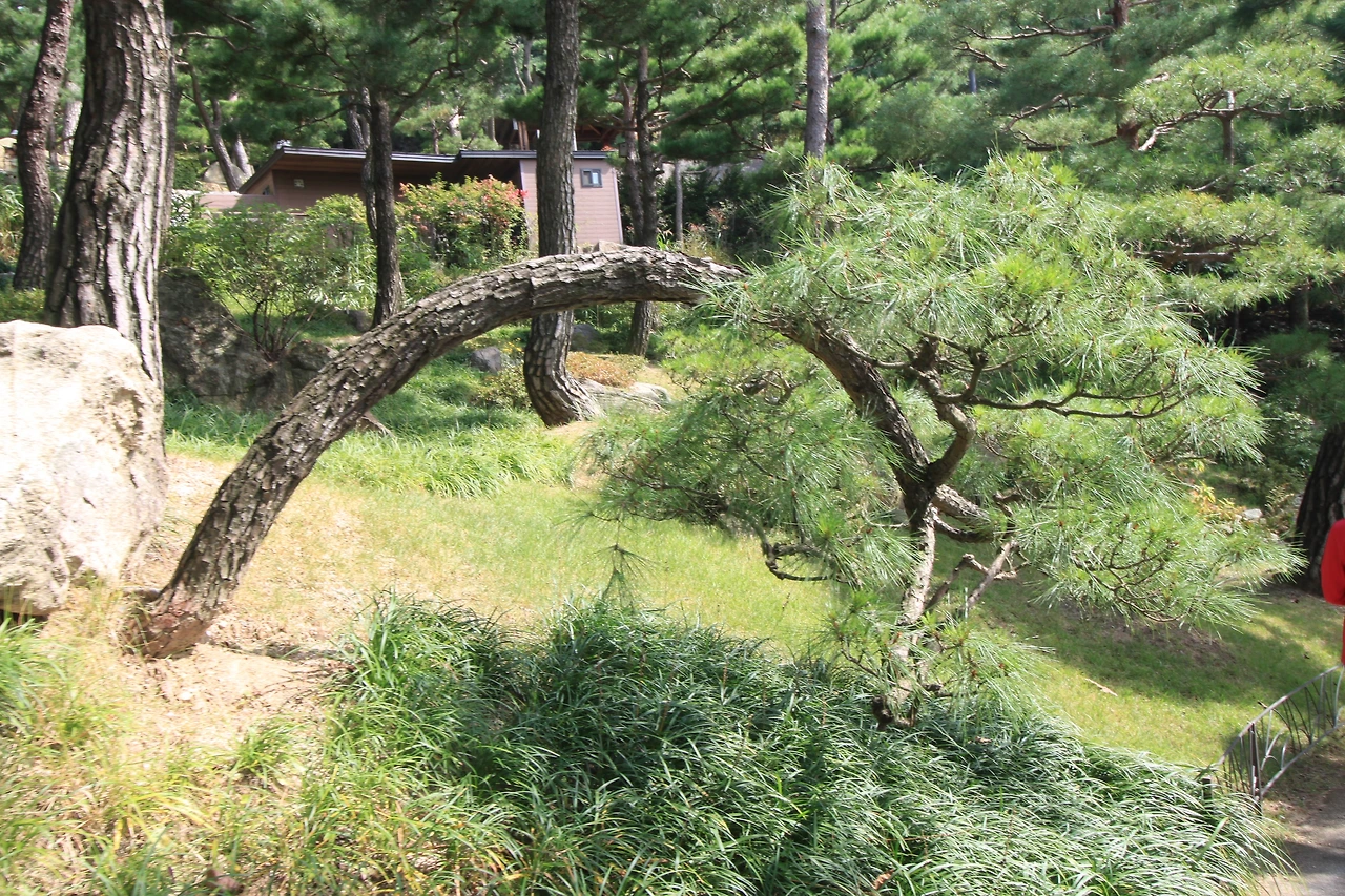 또하나 소나무에 꽂혀있었는데, 이곳에 소나무정원이 있었다. 기기묘묘한 소나무들이 각자의 위용을 뽐내고 있다. 소나무는 특이한 것이 모양이 모두 다르다는 것이다. 심지어는 꺽이어 자라는 것도 있고. 비슷해도 각자 개성이 다른 사람들을 보는 느낌이다. 크고 작고, 휘어지고 뻗은 나무들이 주는 느낌이 모두 다르다. 어른이 팔을 둘러 안았을때의 나무의 둥치가 35년살쯤 된 소나무라 한다.