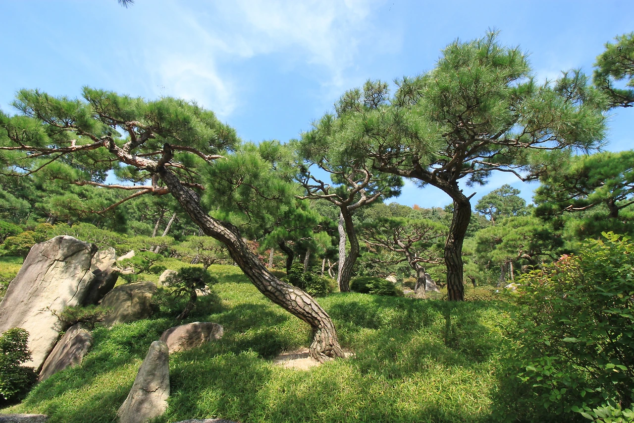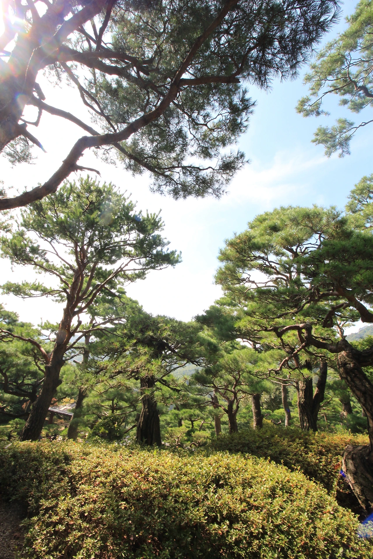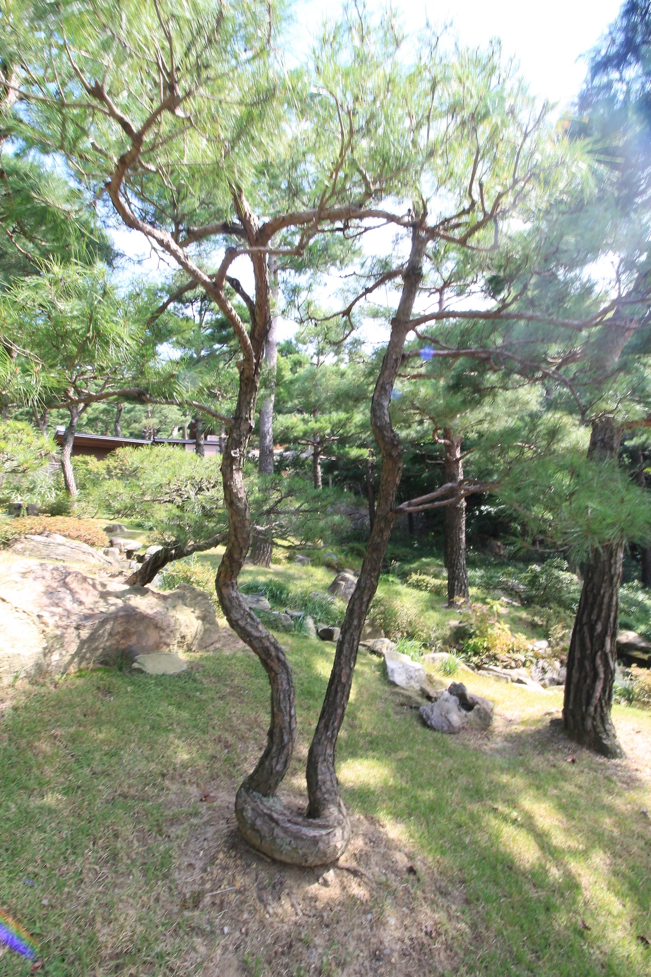 또하나 소나무에 꽂혀있었는데, 이곳에 소나무정원이 있었다. 기기묘묘한 소나무들이 각자의 위용을 뽐내고 있다. 소나무는 특이한 것이 모양이 모두 다르다는 것이다. 심지어는 꺽이어 자라는 것도 있고. 비슷해도 각자 개성이 다른 사람들을 보는 느낌이다. 크고 작고, 휘어지고 뻗은 나무들이 주는 느낌이 모두 다르다. 어른이 팔을 둘러 안았을때의 나무의 둥치가 35년살쯤 된 소나무라 한다.