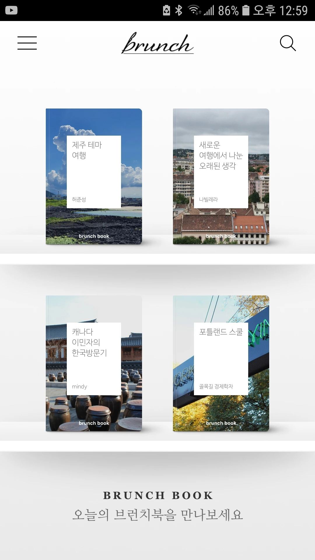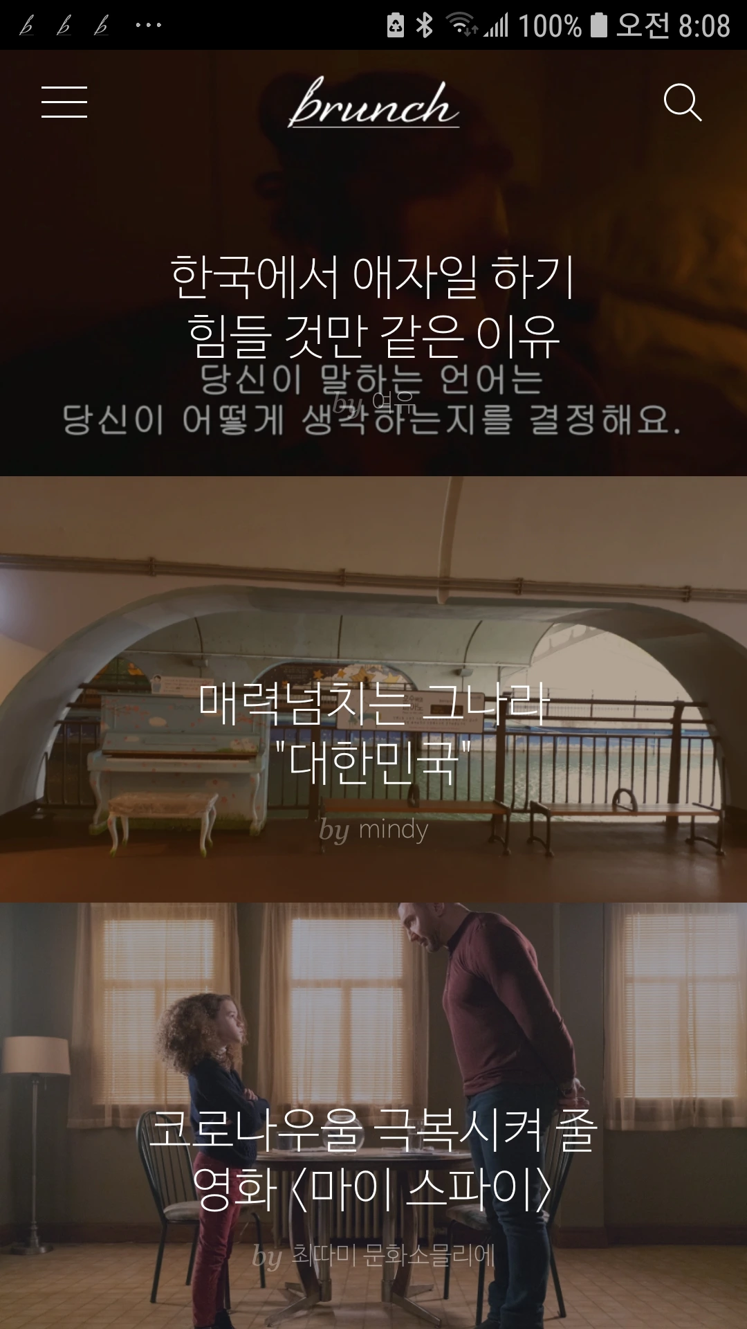 글뿐 아니라 글을 홍보해주는 브런치 앱 홈 페이지도 아무리 봐도 질리지 않는다. 한페이지에 때로는 한 작가의 글을, 4권의 브런치북을, 최대 5 편의 글을 소개해준다. 그곳 글들은 이미지와 함께 제목과 작가 이름까지 오롯이 "읽고싶은 마음이 들게" 배열되어 있다. 사진 혹은 색이 은은한 배경이 되어 글을 소개한다. 그래서 나의 스크롤짓도 사실은 브런치의 디자인 때문에 벌어진다.