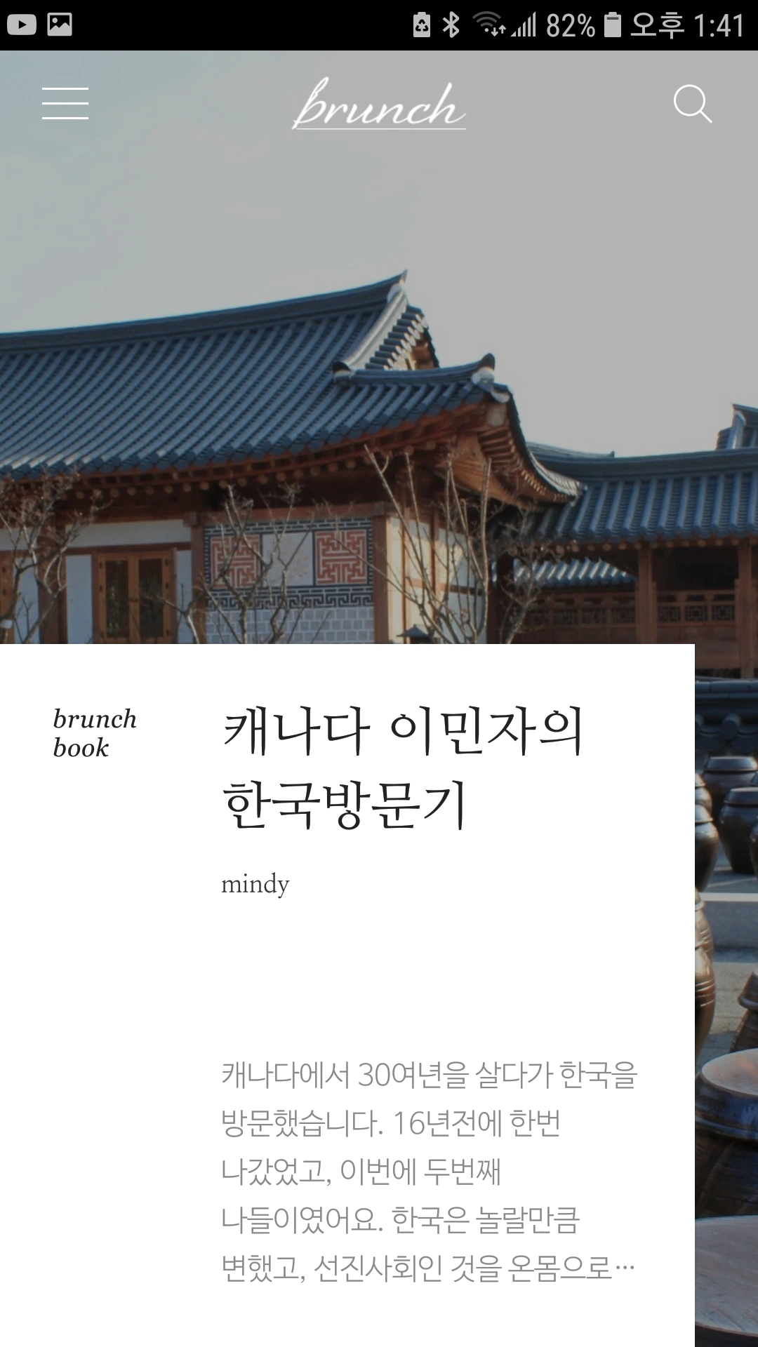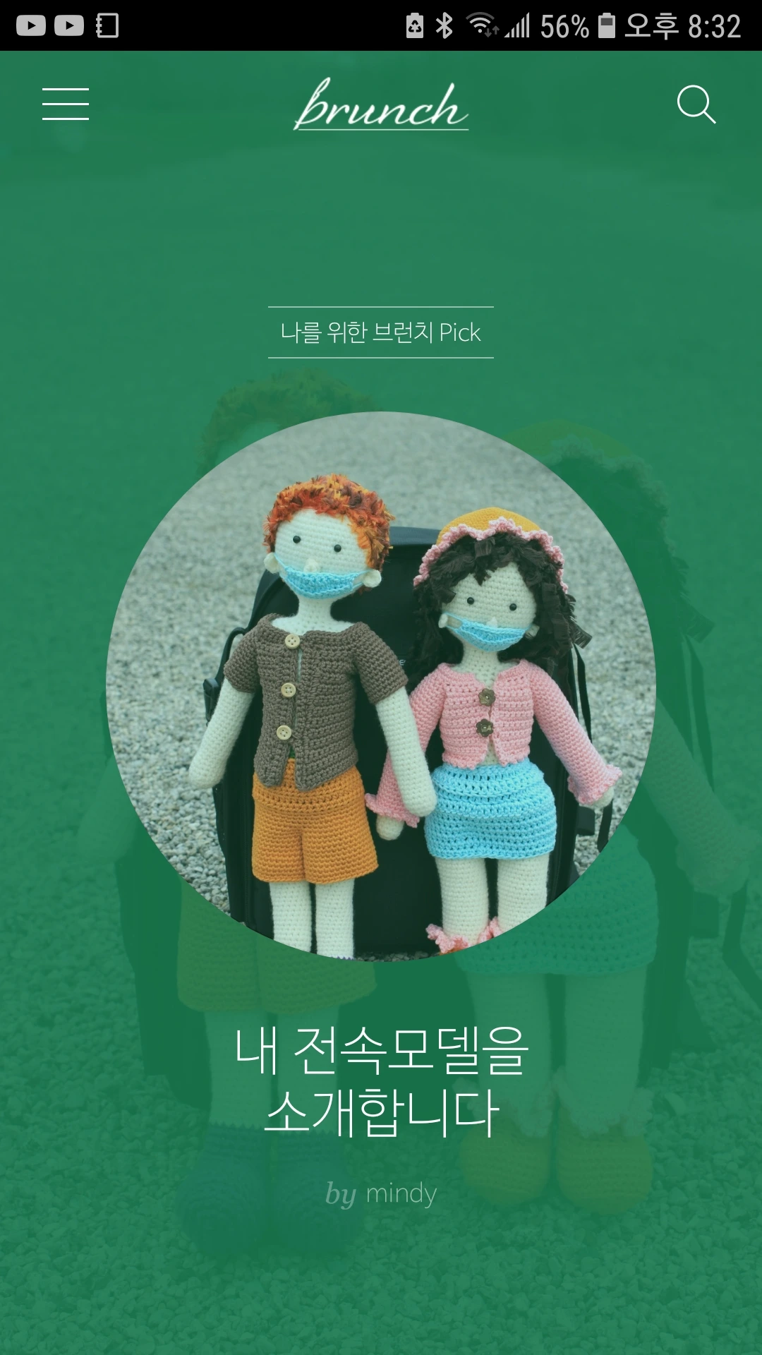 브런치북안에 있던 글중 "매력넘치는 그나라 대한민국"이 따로 노출되었고, "내 전속모델을 소개합니다"는 그야말로 눈깜짝할 사이에 올라왔다가 사라졌다. 내가 그 시간 스크롤 노동을 하지않았으면, 올라왔는지도 몰랐을 것이다. "전속모델" 소개 화면이 제일 마음에 든다.