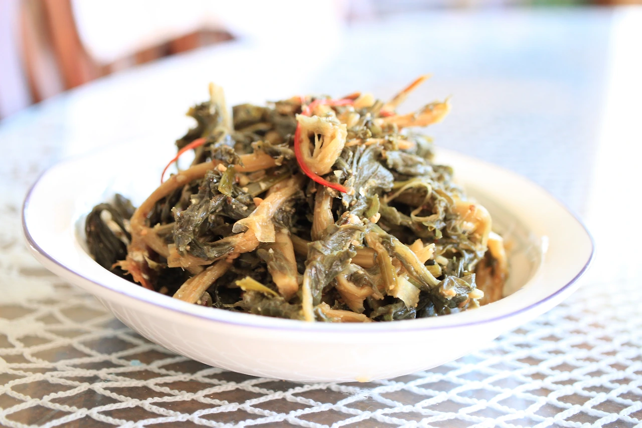 4) 육수에서 건져낸 소고기와 데쳐놓은 고비, 토란대를 넣고 고춧가루, 마늘, 국간장을 넣고 무쳐놓는다.