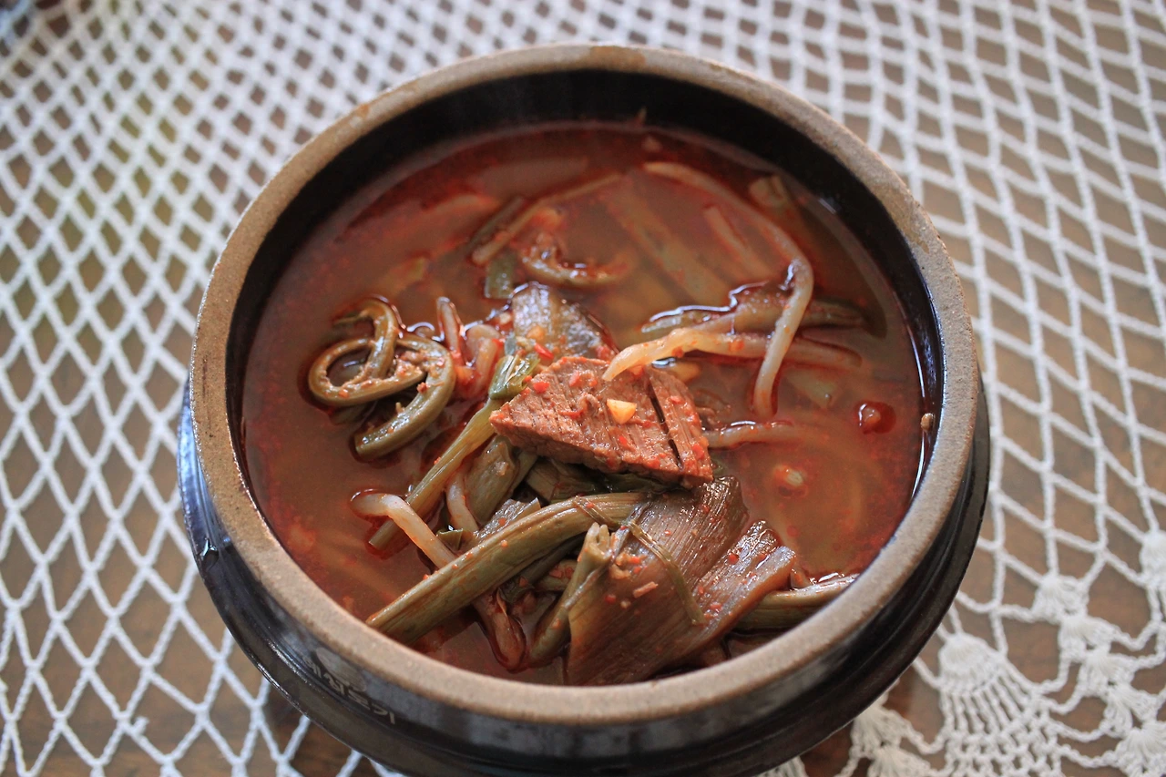 사진 위로부터 무말랭이 무침, 시래기 나물, 육개장