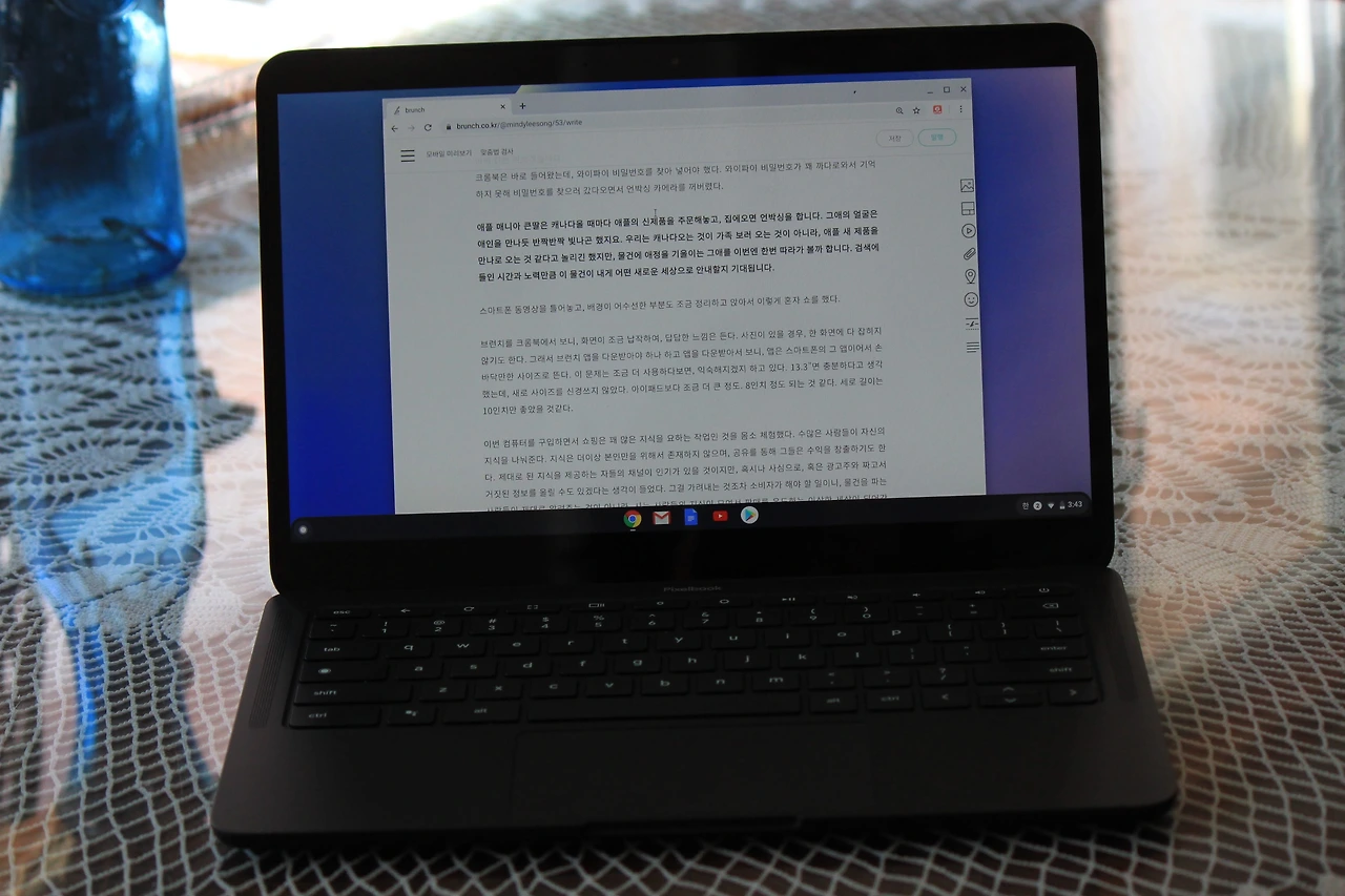 브런치를 크롬북에서 보니, 화면이 조금 납작하여, 답답한 느낌은 든다. 사진이 있을 경우, 한 화면에 다 잡히지 않기도 한다. 그래서 브런치 앱을 다운로드하여야 하나 하고 앱을 다운로드하여서 보니, 앱은 스마트폰의 그 앱이어서 손바닥만 한 사이즈로 뜬다. 이 문제는 조금 더 사용하다 보면, 익숙해지겠지 하고 있다. 13.3"면 충분하다고 생각했는데, 세로 사이즈를 신경 쓰지 않았다. 아이패드보다 조금 더 큰 정도. 8인치 정도 되는 것 같다. 세로 길이는 10인치 정도만 되어도 좋았을 것 같다.