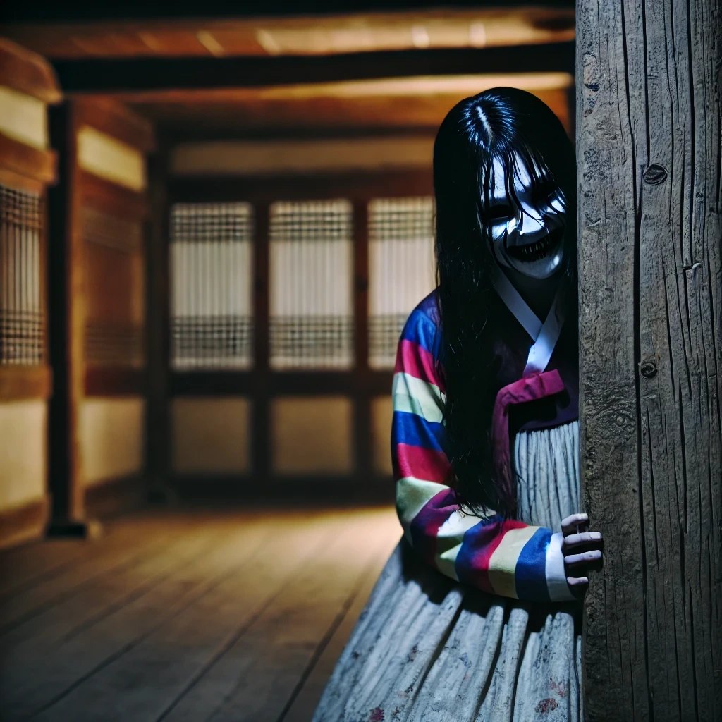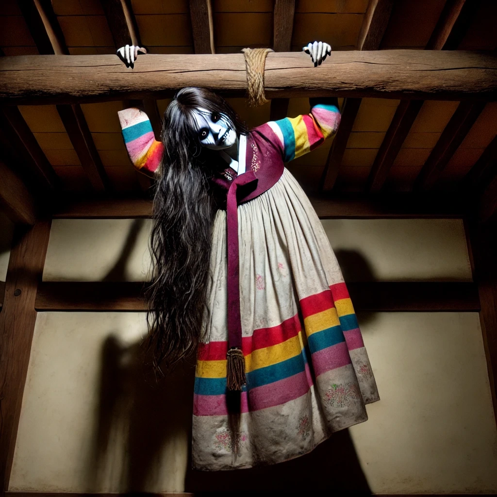 플래시를 계속 비추자, 여자의 모습이 더 자세히 보였다. 색동저고리를 입은 여자아이의 모습치고는 얼굴 한가득 주름이 가득했고 산발 한 머리는 윤기 없이 희끗희끗 제멋대로 엉켜있었다.