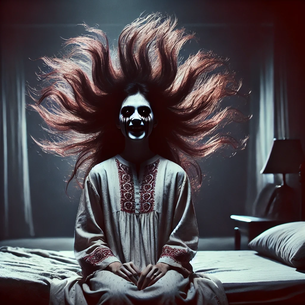 그녀의 헝클어진 검은 긴 머리는 마치 살아있는 듯 어두컴컴한 방 사방으로 흩어졌고 귀까지 찢어진 붉은 실 같은 입술에선 기괴한 쇳소리가 찢어져 나왔다.