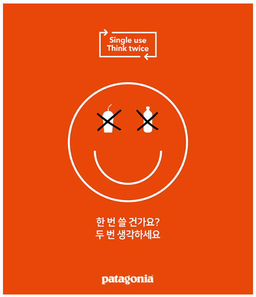 파타고니아는 지구 환경 문제를 해결하기 위해 끊임없이 노력하고 있는데, 최근에는 '두 번 생각하세요(Single use Think twice)’라는 캠페인으로 플라스틱 컵 사용을 줄이고, 플라스틱 사용에 대한 습관을 다시 생각해보자는 온라인 서명을 통해 사용자들에게 환경에 대한 경각심을 다시금 일깨워준다.