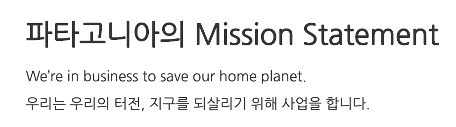 보통 기업 브랜드 미션은 기업이 존재하는 이유, 혹은 사명이라고 말할 수 있는데, 기업이 궁극적으로 지향하는 점을 말한다. 파타고니아의 기업 미션은 환경 보호에서부터 시작이 된다.