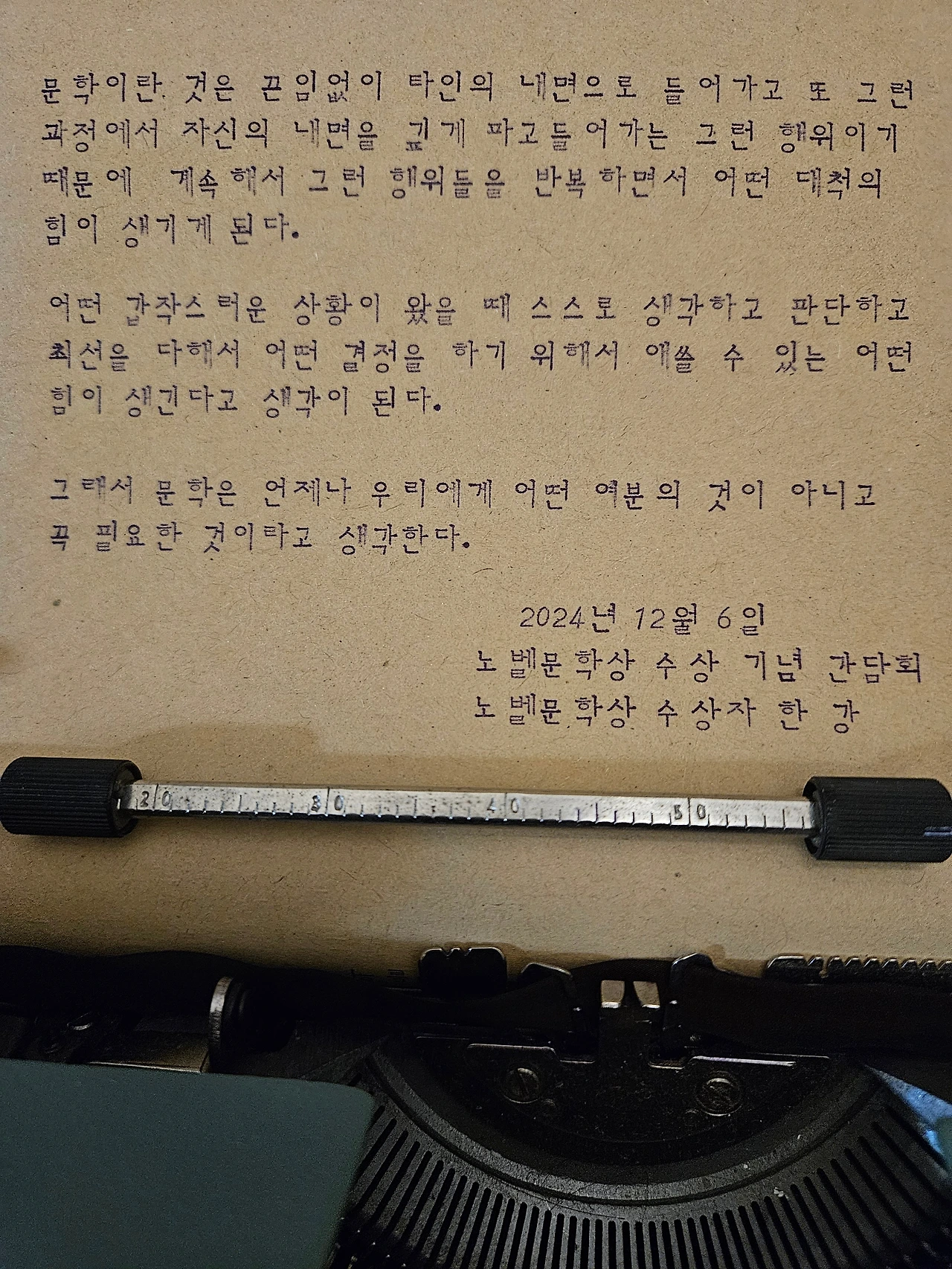 올해 노벨문학상 수상자로 선정된 작가 한강은 6일(현지시간) 계엄령과 관련해 “충격을 받고 뉴스를 보고 있다”고 말했다. 한강은 이날 오후 스웨덴 스톡홀롬에서 열린 노벨문학상 수상 기념