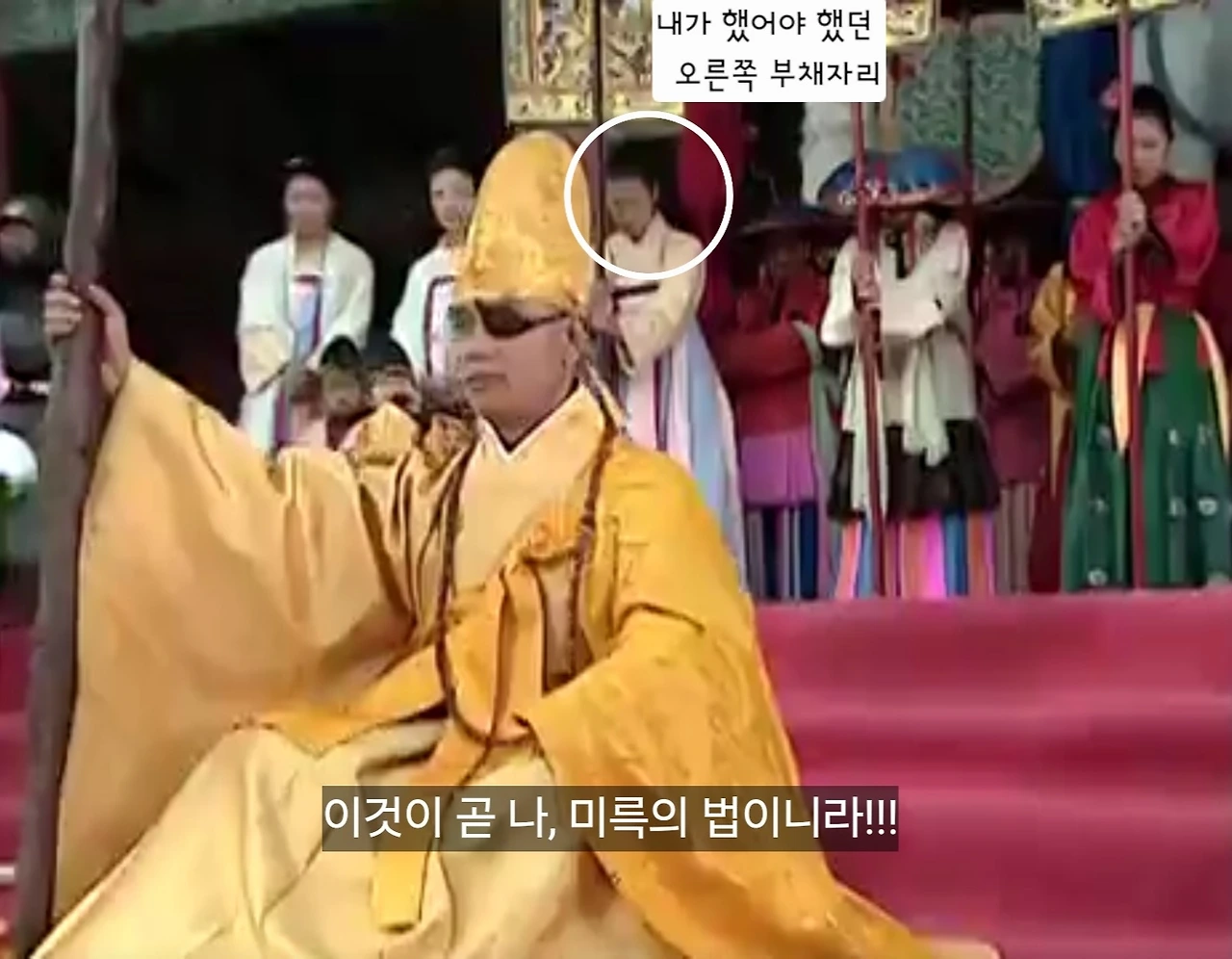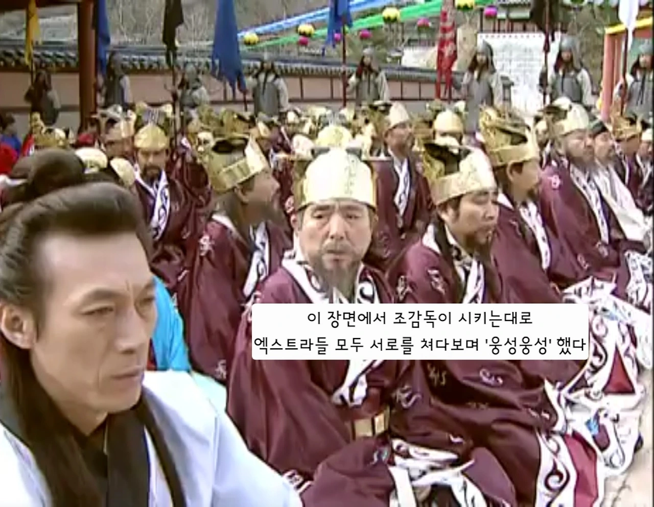 자리에 앉은 궁예가 석가모니는 자신의 영험한 수행의 결과를 가로챈 도둑이고 진정한 미륵은 궁예 자신이니 앞으로 본인이 만든 법전만 읽어야 한다고 근엄한 목소리로 선포하였다. 그다음 신을 찍기 전 조감독이 법당 안에 앉아있는 엑스트라 모두에게 촬영을 시작하면 양 옆을 서로 쳐다보며 웅성웅성 해달라고 했다. 앞서 찍은 궁예가 미륵임을 선포 한 이후 바로 이어지는 장면이었다. 촬영이 시작되자마자 앞자리에 앉아있는 중요배역의 배우들은 매우 심각한 표정을 지었고 뒷줄에 쭉 앉아있던 엑스트라들은 서로를 쳐다보며 누구나 할 것 없이 정말 "웅성 웅성" "웅성 웅성"이라고만 이야기해서 그 옆을 지키고 있던 친구는 터지는 웃음을 겨우 참았다고 했다.