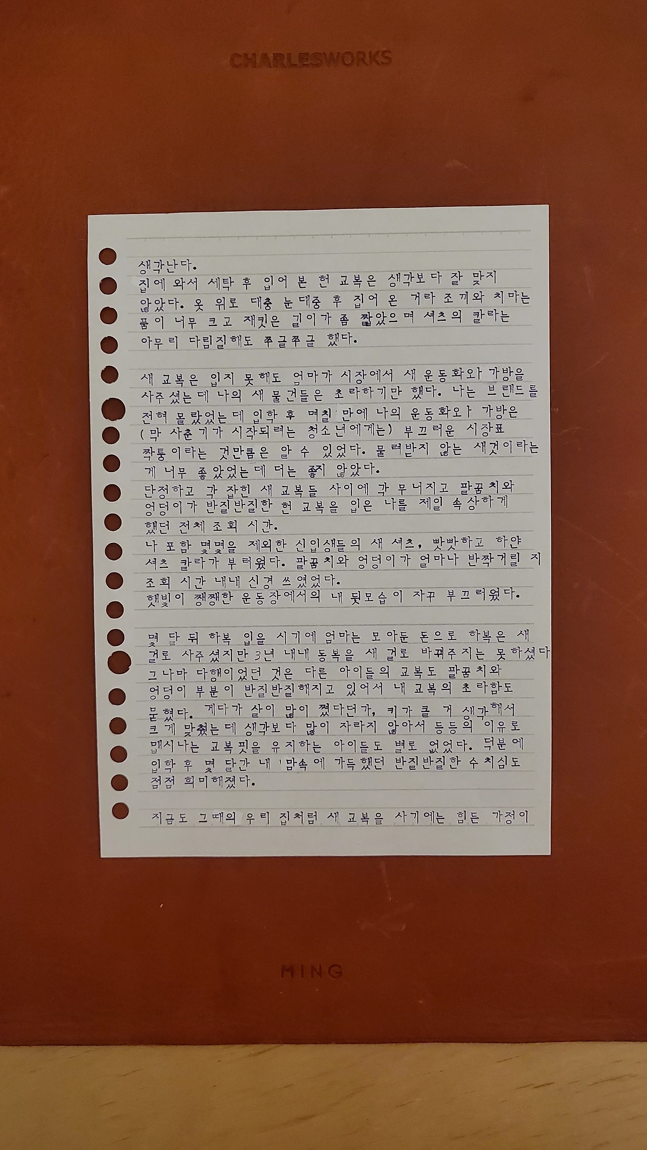 저희 집 근처 중학생들을 보면 체육복을 많이 입고 다니더라고요. 실제로 자주 입지 않아 상태가 좋은 교복들이 많다고 하는데 제가 중학생 때 물려받은 교복은 3년 내내 입은 옷이라 상태가 정말 안 좋았어요.