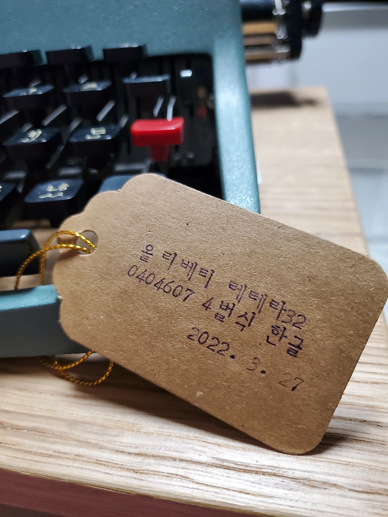 제 소중한 타자기들에게도 Tag를 만들어줬는데 브랜드와 글씨체 정보, 타자기 고유의 일련번호와 제가 구입한 날짜를 타이핑해서 걸어주었습니다.
