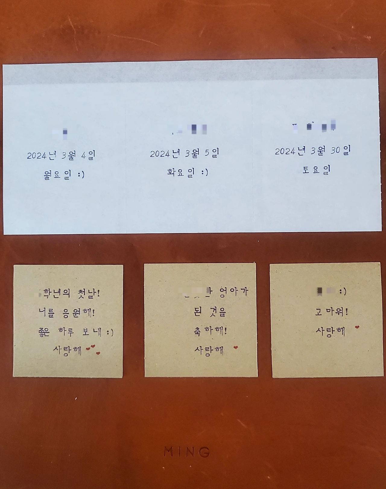 새 학기 아침에 식탁 위에 올려놨더니 아이들이 아주 좋아했어요. 새로운 반에 적응해야 하는 아이를 위한 짧은 응원편지! 가끔씩 너무 좋은 선물인 것 같습니다.