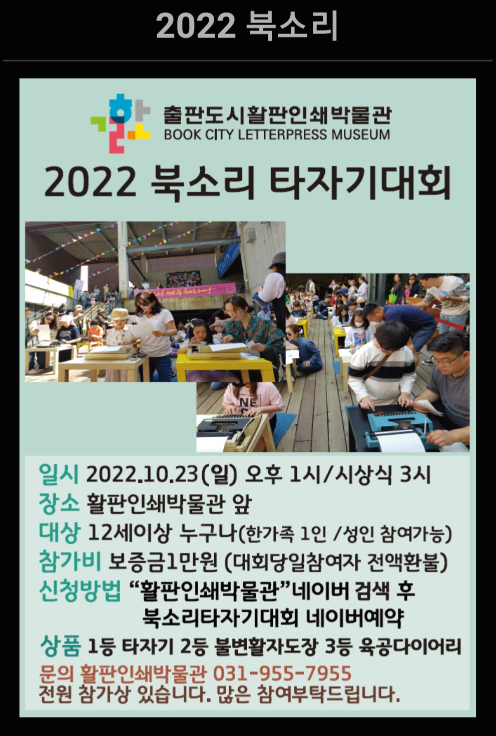 파주의 '활판인쇄박물관'에서 5월은 초등생을 대상으로, 10월은 중학생~성인을 대상으로 '북소리타자기 대회'라는 아주 재미있는 타이핑 대회를 합니다.