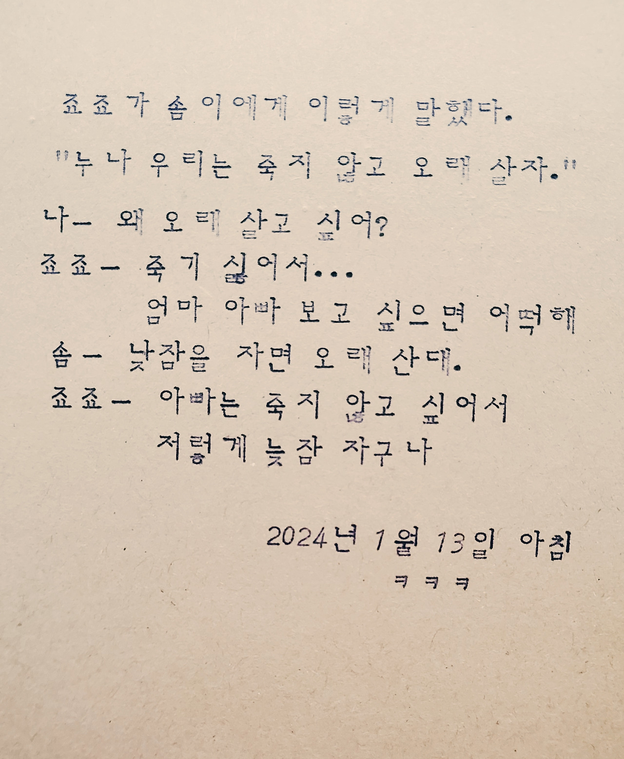 친정아버지가 돌아가시고 난 후 제가 많이 슬퍼해서 죠죠가 죽음에 대해 생각이 많았어요.