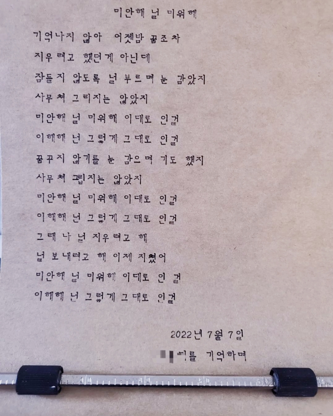 너는 알고 있을까 너에게 인사하러 가는 길 너와 지냈던 그 시간들을 하나하나 떠올려 보려고 생각하고 또 생각했어. 노래를 잘 부르는 것 외에도 엄마처럼 동기, 선 후배를 잘 챙겼던 너의 20살.