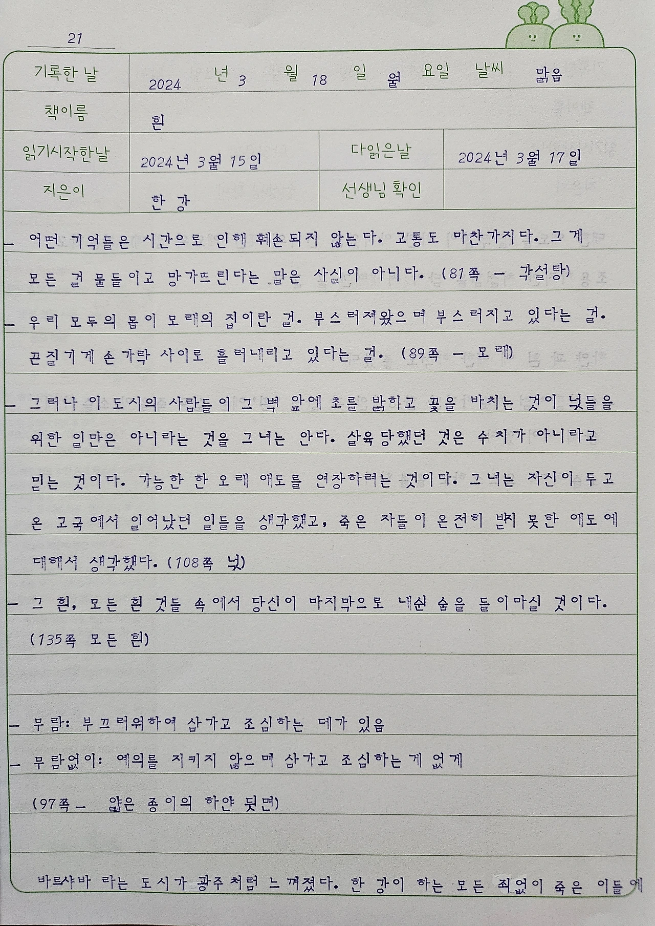그리고 이어지는 '흰' 한강작가님의 온 마음을 다한 애도의 이야기입니다.